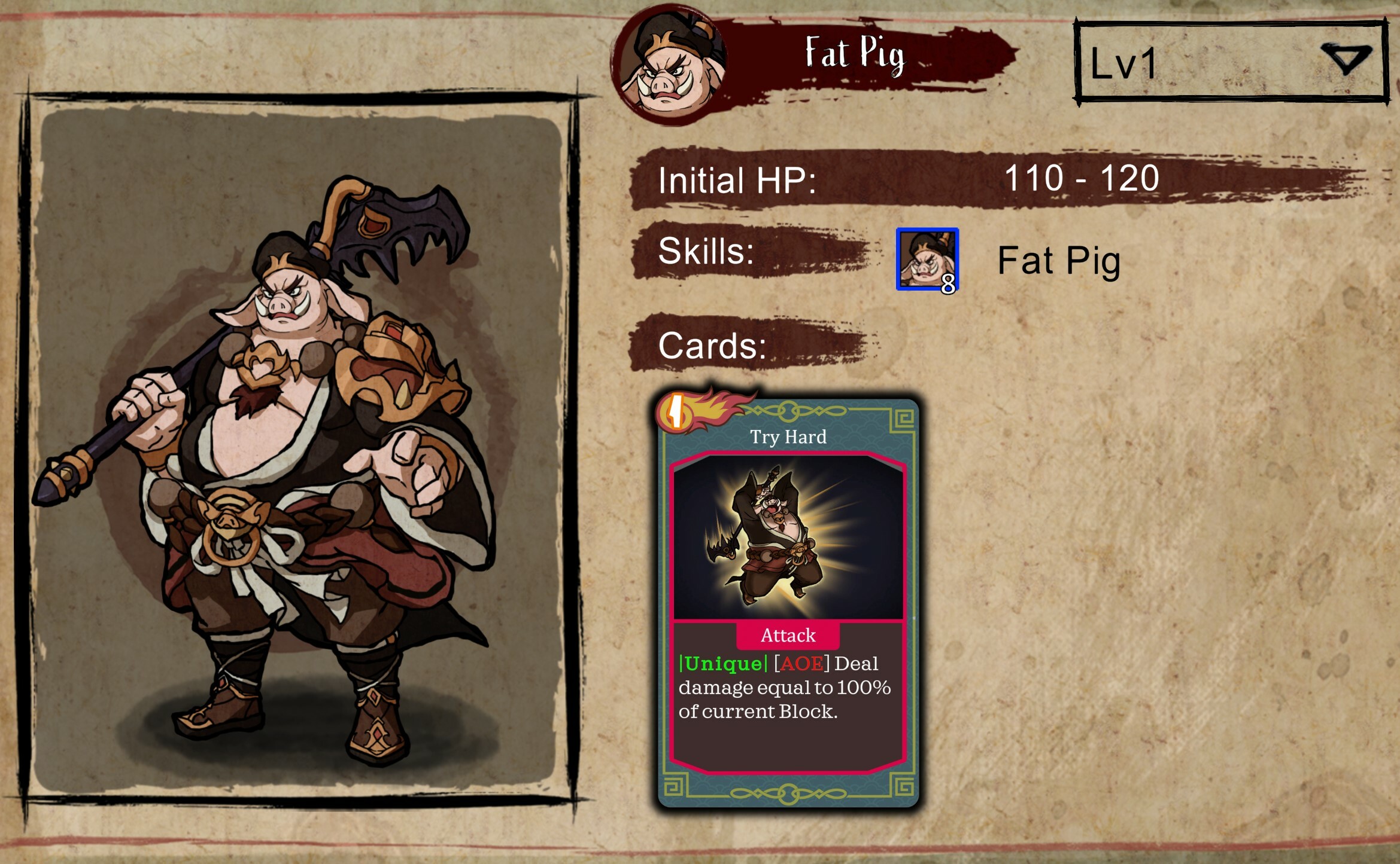 Check out some skills! Swine King has a "Bottomless Stomach" - he can eat any consumables to gain hunger points and additional buff and damage.