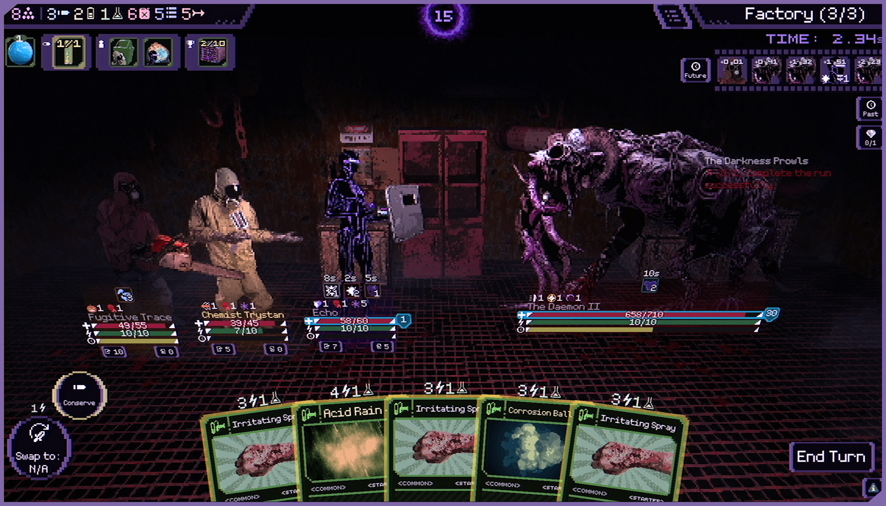 - (Enemy) Earth Eroding Worm: Bloodlust: Stacks 2->1, Cooldown is now global, Cooldown 30->20. Earthquake: Repeat 4->3, Probability 1x->0.5x, Cooldown 6->12. Melt Eyes: Unlock at turn 0->4. - (Card/Flashlight) Flash Step: Now reduces energy cost of drawn cards until next move activation, instead of until the end of turn. - (Card/Dark Cannon) Recall: (+1: Also draws 1 move.) - Magician’s Glove no longer activates Unusable moves. - Fixed Condition UI hover being blocked when entity info tooltip is visible during encounters. Hovering over condition and status icons should now easily display tooltips. - Removed the screen-wide flash effect of certain attacks when “Enable Flashing Lights” option is turned off. - Fixed an issue where Level Up window text would keep coming to the foreground during Leo’s level up card selection. - Fixed a typo/parameter error in the Darkness Filled Corridor event. - Fixed a typo/parameter error in Cleave card’s description. - Fixed some of the card tooltips overflowing outside the screen. - Reduced the difficulty of the dialogue puzzle for discovering the Lair location in Mona’s path. Required max. stress value is increased from 5 to 8. - Fixed Suppressor item increasing energy cost instead of decreasing for cards created during encounters. - Fixed some of the non-damage dealer moves (eg. Prepare for War, Bloodbath…) with reference damage values being classified as damage dealer by some effects. - Fixed an issue where Daemon’s movement created a trail on the map. - Updated localization progress.
