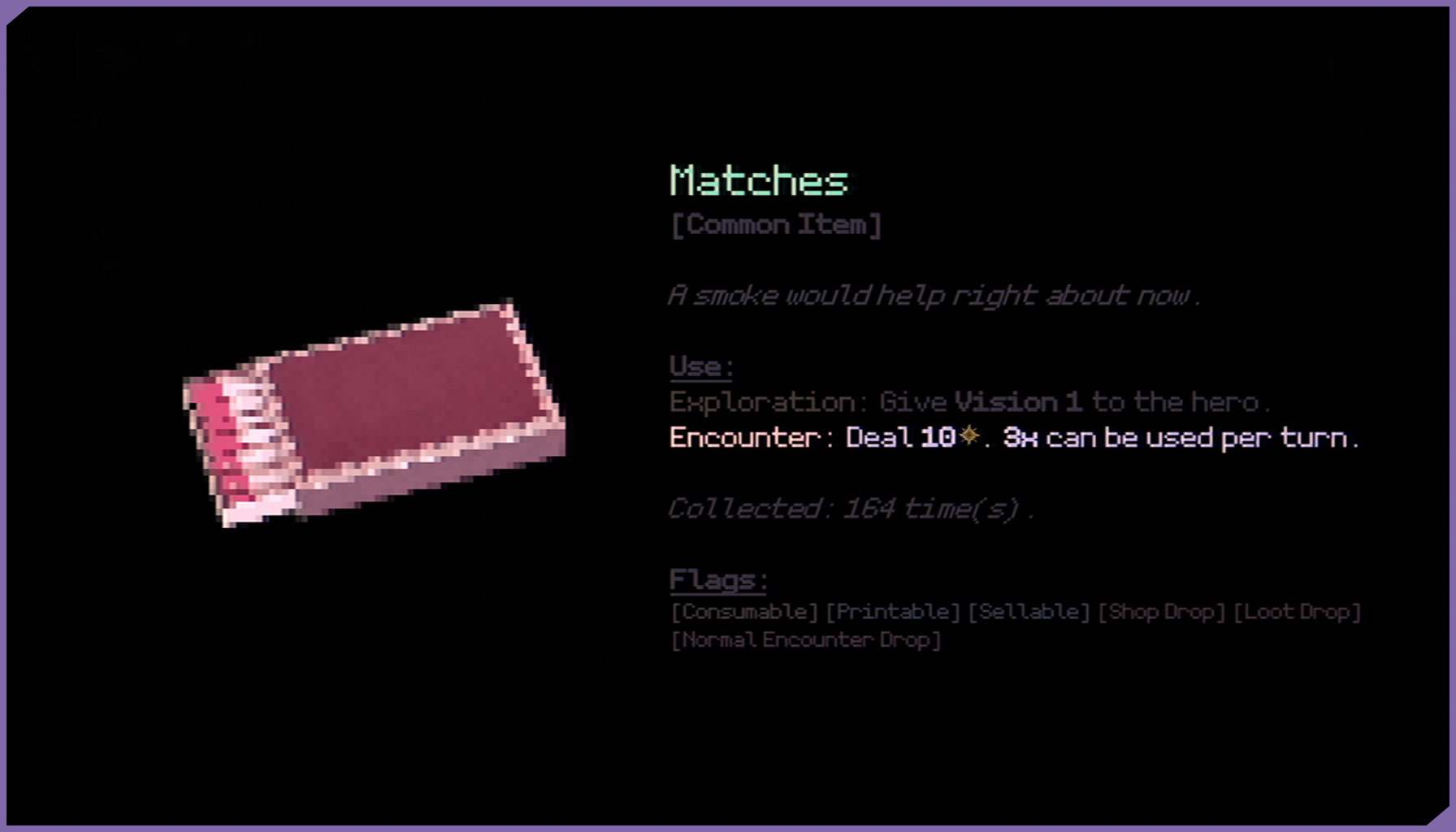 I’ve implemented a frequent suggestion by adding encounter-phase effects for the Matches and Flare consumables. Flares can now be used to reveal Stealthed enemies by applying the "Revealed" status, which you may have guessed based on their exploration phase functionality. This makes Flare a useful item to have in case an enemy goes stealth and becomes untargetable—a rare but scary occurrence.