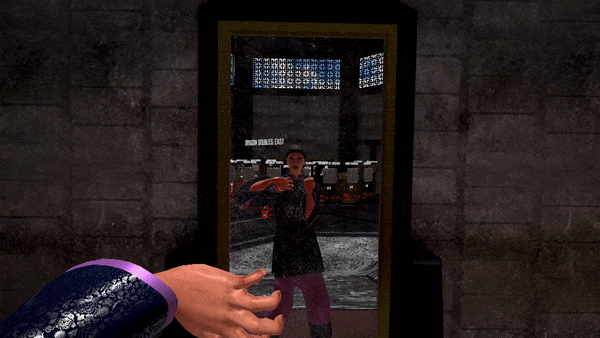 Mirror in the level select/practice/general room - the reflection is a bit smaller than real life, and it looks like it comes out the mirror a bit, but I've enjoyed posing in it, feels strange looking in a mirror and seeing someone else look back