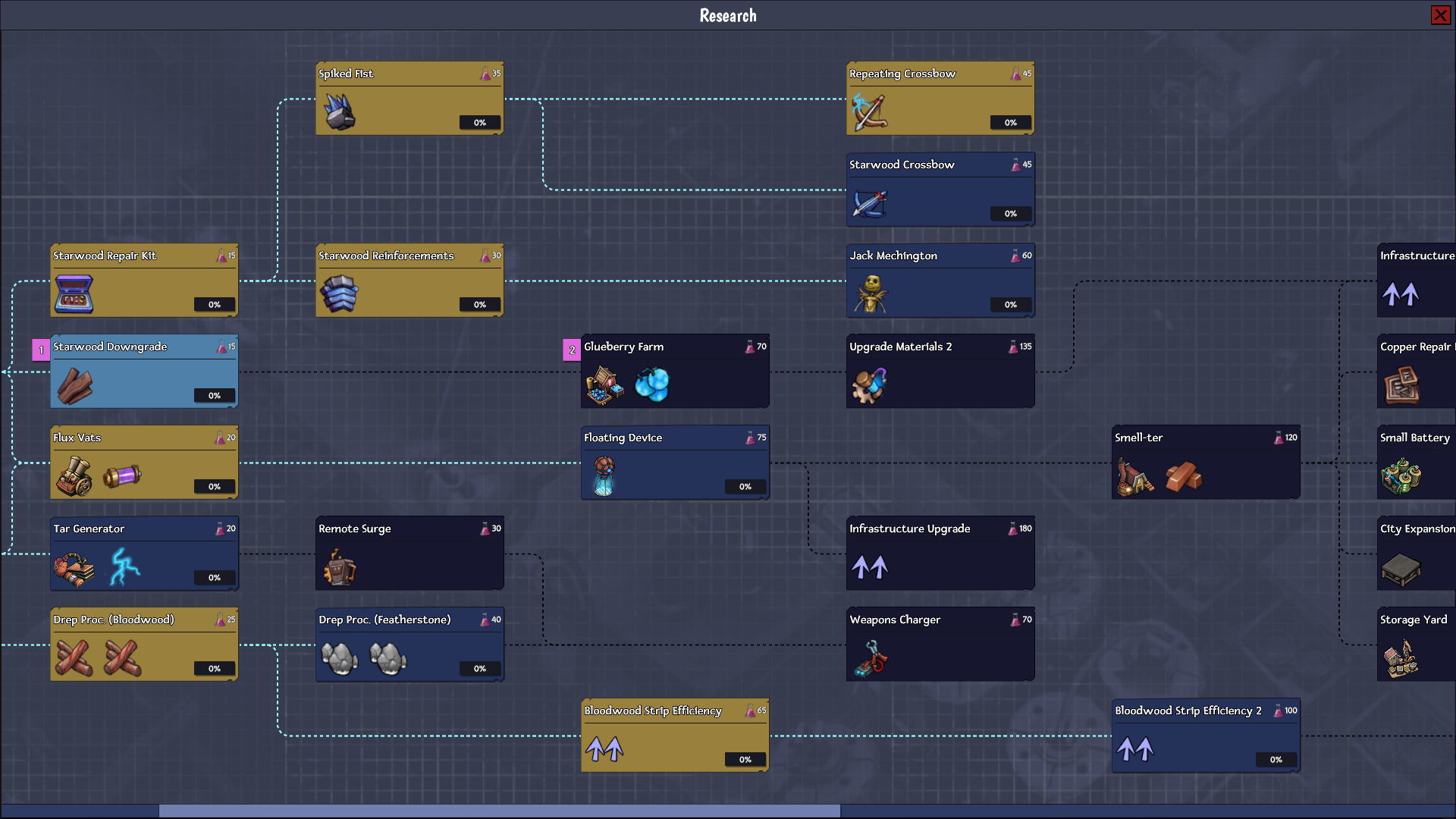 Unfortunately, I found that it wasn't a perfect match for our needs. Sometimes it didn't make sense to have separate researches for separate items (like wall & gate), and it made it that much harder to build a graph with reasonable dependencies when each node in the graph could only be one item, and every single item in the game (except those you start with) required their own node.