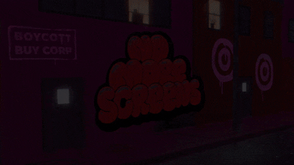 The game world has the job of telling the story of customer retaliation against Buy Corp, in this case, graffiti that plasters the walls of buildings. The message is clear: customers don’t want to be hypnotised or spend money on stuff they don’t need, but Buy Corp is highly persuasive. It’s David (the customers) vs Goliath (Buy Corp) and you fit in somewhere in the middle.