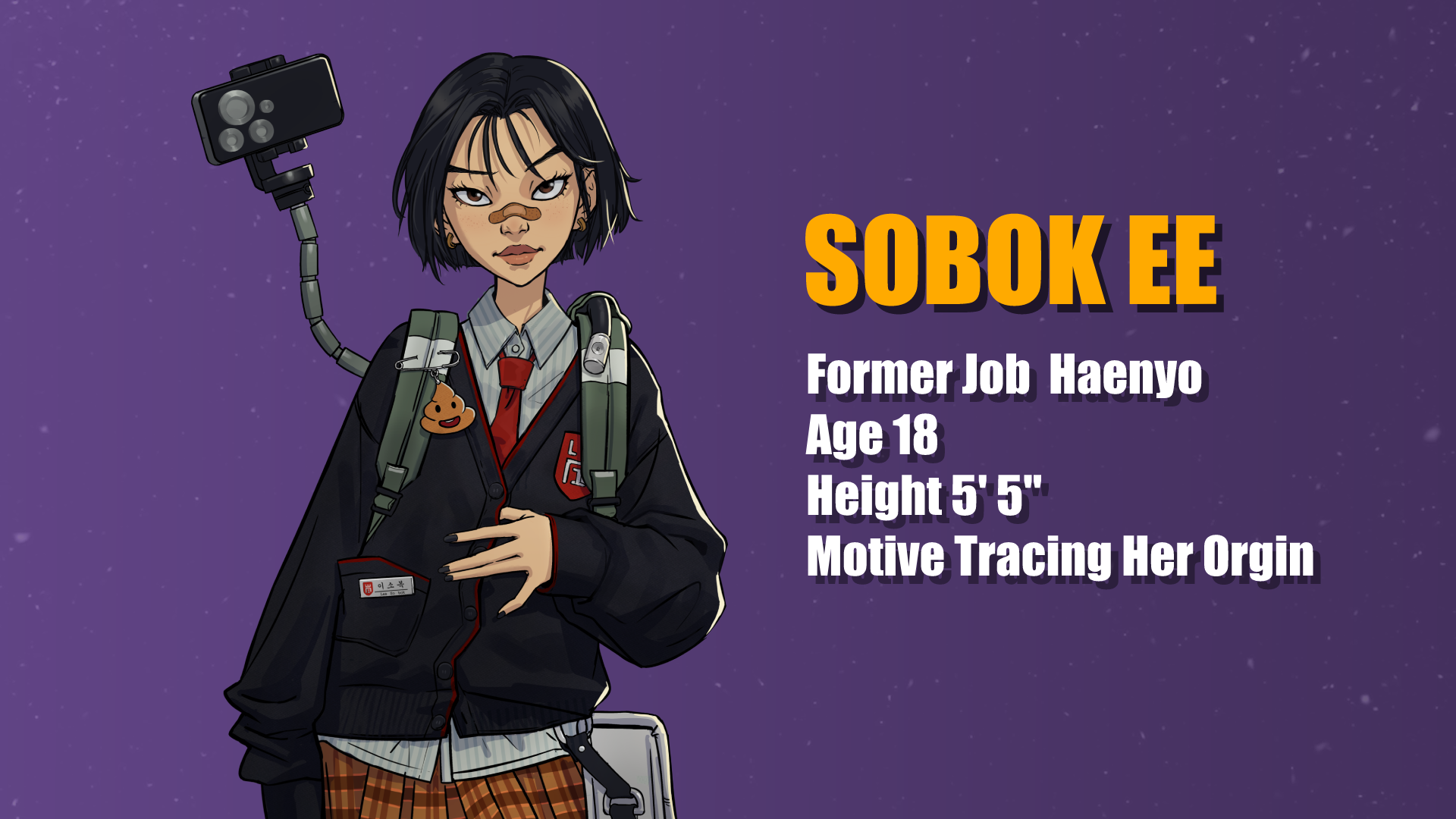 Sobok's parents worked as researchers for Shadd's resource research HQ while also supporting an eco-friendly NGO called Blamane. However, trouble arose when Shadd demanded unethical research on keystones, causing a conflict between Sobok's parents and the company. As an internal spy for Blamane, they planned to expose Shadd's unethical research. However, when Shadd discovered their plans, they sent people to capture them, and Sobok's parents had to send her away to safety on Jeju Island.