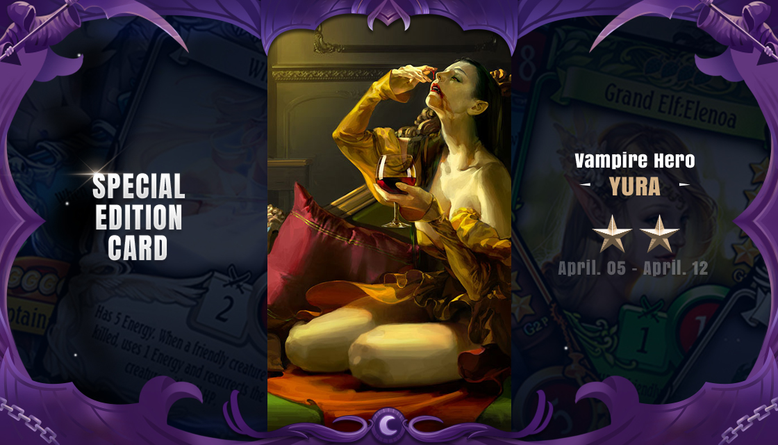 She's the hero we didn't deserve. No really, she'd drink your blood just to sustain herself. What kind of hero is that?! Get Special Edition Vampire Hero Yura from 4/5-4/12 from any booster packs as a 1% drop rate!