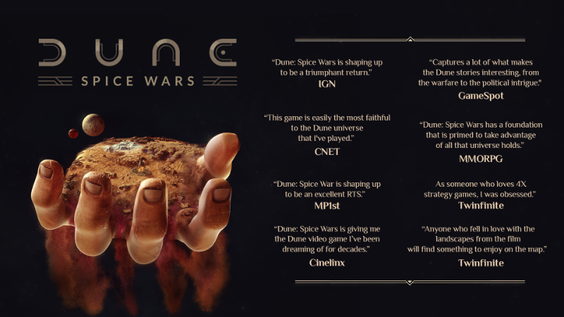 "Overall, I'm very impressed so far with Dune: Spice Wars [...] Even in its early access form, Dune: Spice Wars is shaping up to be a triumphant return.” - IGN