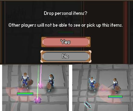 • Item that got the "Blacksmith Protection" will become personal item, when you try to drop those items on the ground, other player will not be able to see or pick them up. (this is similar to the "soul bound" items in MMO game sense) This system will also applied to valuable items such as "Memory Fragment" as well. The personal item will display pink aura. The game will issue warning when you are trying to drop such item.