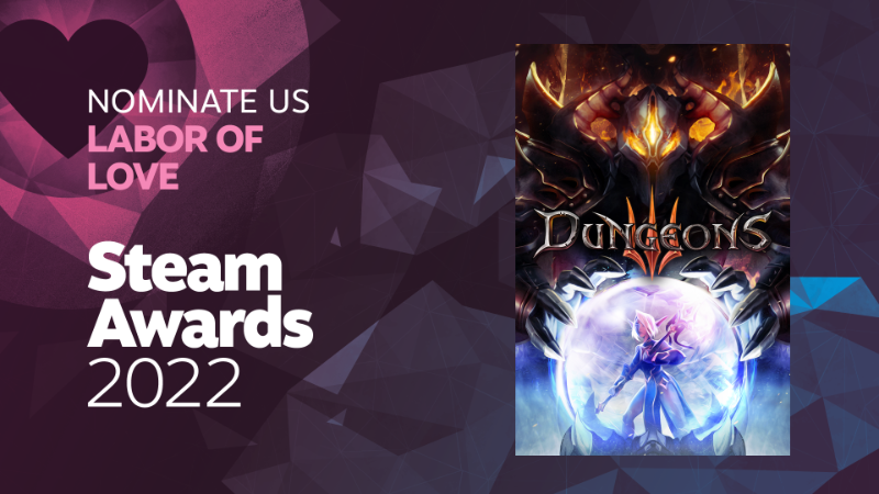The Ultimate Evil wants some love…just this once. If you have any warm and fuzzy feelings for the most despicable being in existence, feel free to nominate Dungeons 3 for the ‘Labor of Love’ award in the 2022 Steam Awards.
