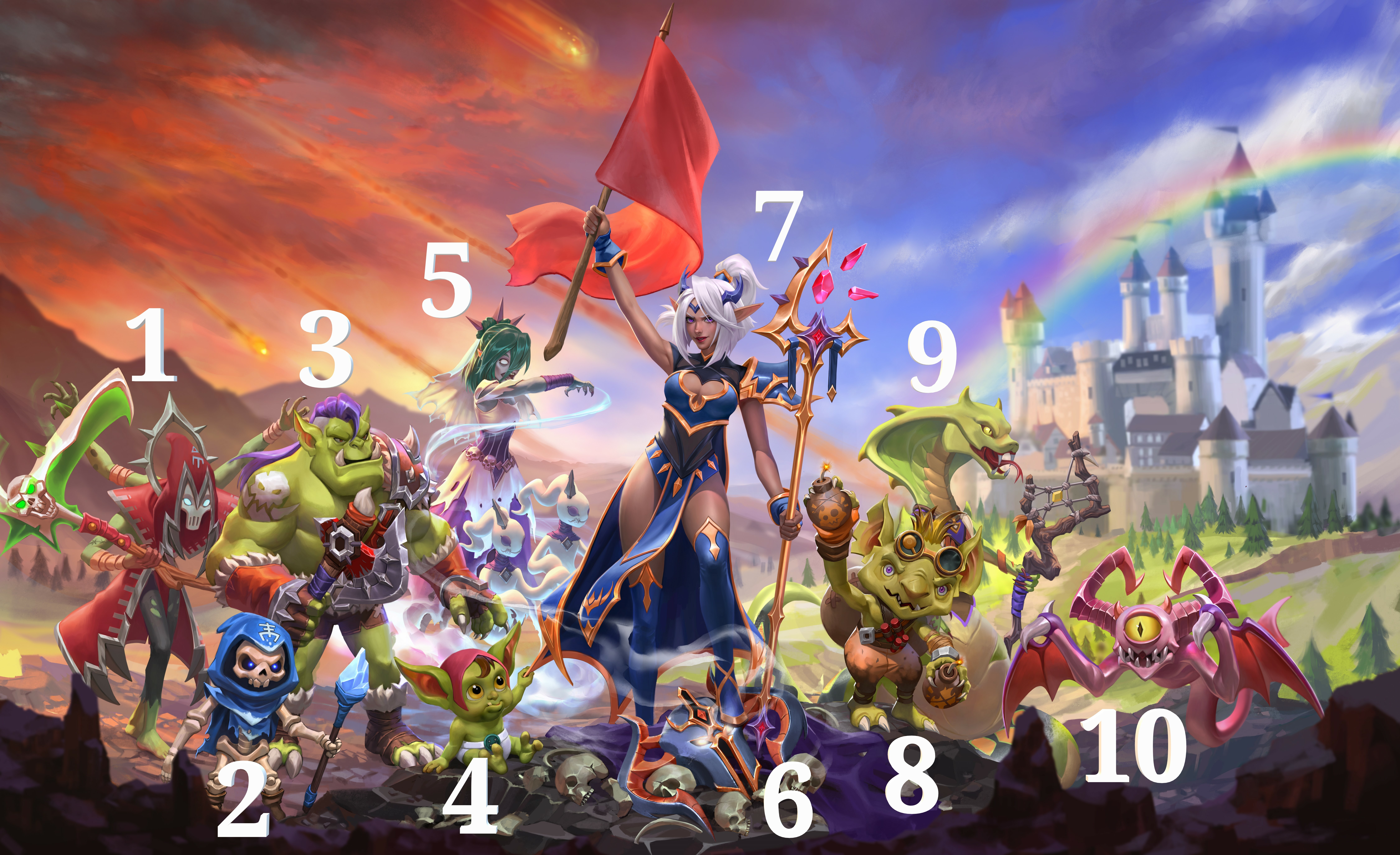 From 1 till 10: Necromancer, Skeleton Mage, Orc, Gorgu (The Baby Evil), Banshee, The Absolute Evil, Thalya, Gnome, Naga, Imp (No, these Little Snots are absolutely not here to bring you to the torture chamber if you chose the wrong character, wdym?)