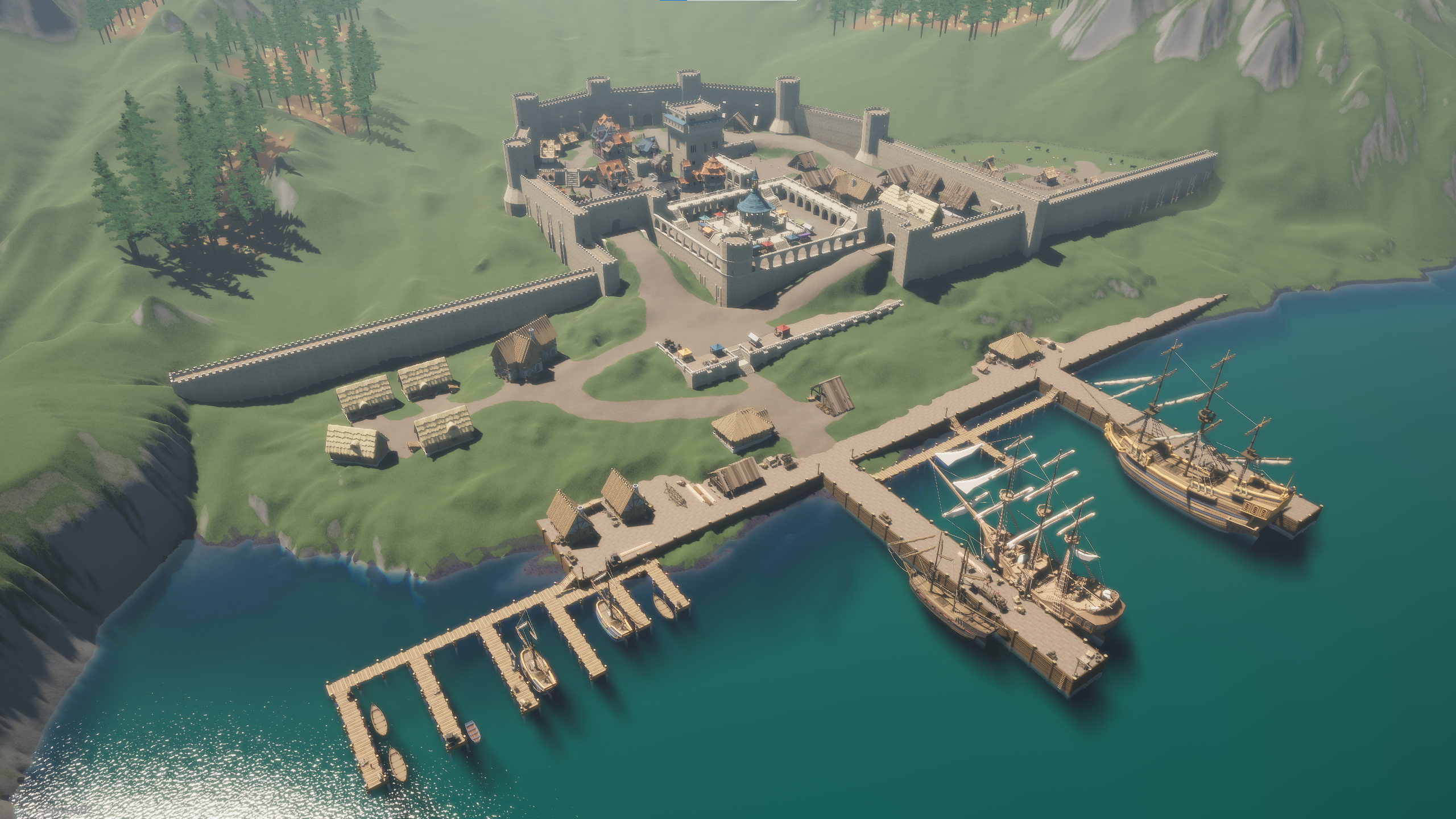 Still have to add in all the people, jobs, smaller details and props, but the areas and buildings are fairly well defined with the harbour, walls and towers, central keep, marketplace, residential and industrial sections, training grounds, and exterior livestock farm.
