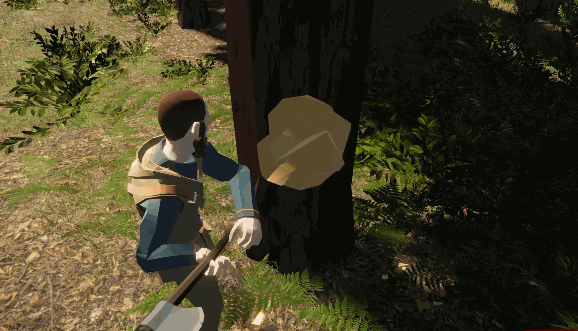 These features utilize the game's destruction and physics systems, where objects in the world can be destroyed, or damaged, or in this case cut in half and then smaller pieces to produce a new resource - Logs.