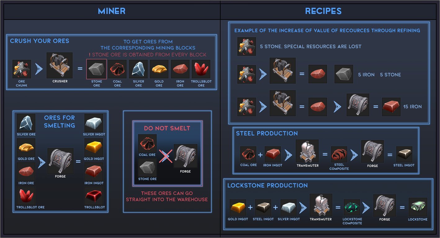 Please keep in mind that this is a work in process and we may change the set-up of these as the game progresses in Early Access. If you play DwarfHeim today - this is recipe on getting the different minerals! We hope that it helps you all to enjoy the wealth a good Miner can provide!