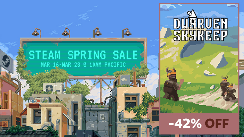 Spring has arrived and it brings great news! Dr.Kness and the dwarves are happy to announce Dwarven Skykeep participation in Steam Spring Sale this year! From March 16th to 23rd everything you can imagine is on sale & more!!