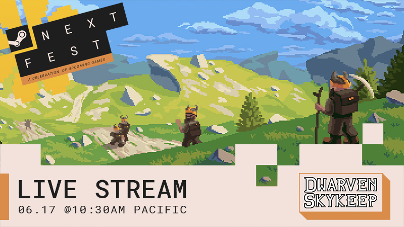 Taking part in Steam Next Fest along with other awesome games, we are happy to announce that you will see Dwarven Skykeep live stream which will start 06.17 10:30 AM (PST)! In order to celebrate the fest, we are going to stream 24/7!