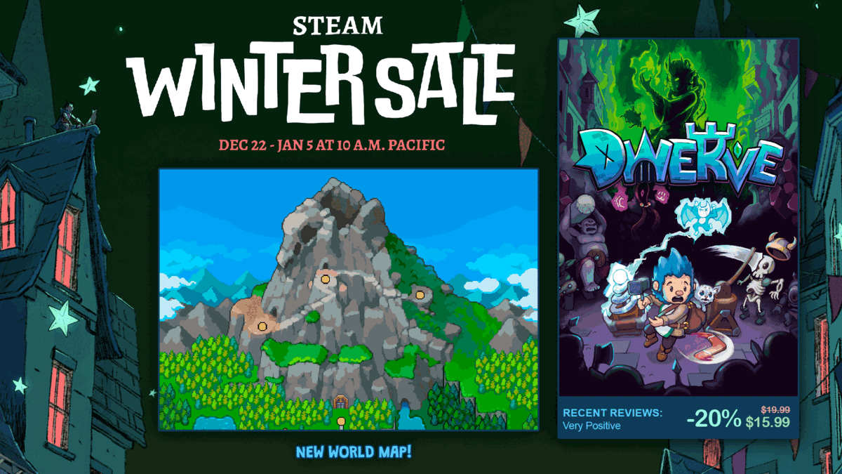 Dwerve is 20% off until Jan 5! We also just released the brand new World Map! We've been working hard to improve the game since launch and are happy to reach Very Positive recent reviews!