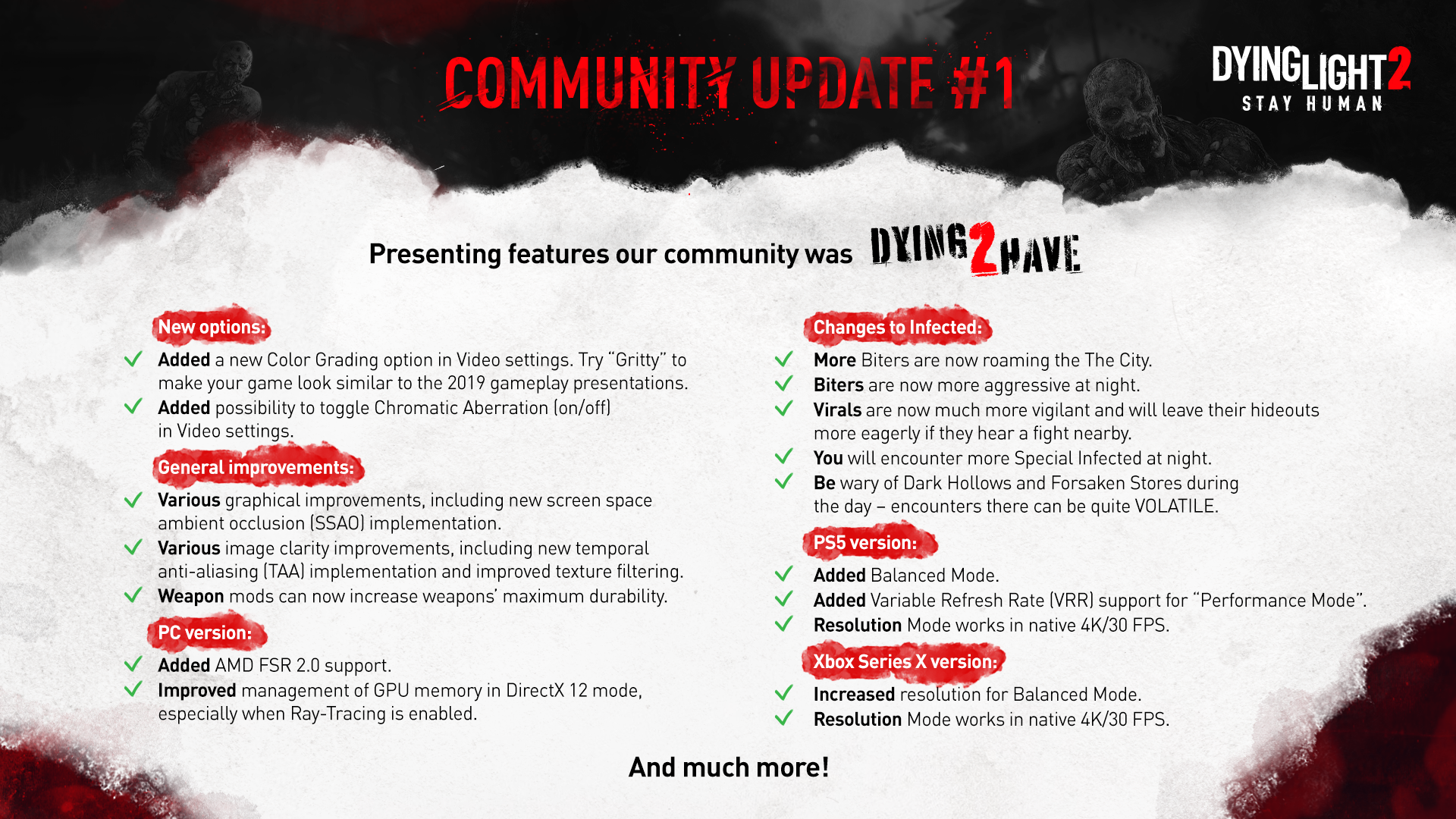 Before experiencing this extravagant new DLC, we invite the community to revisit the last bastion of humankind in Dying Light 2 Stay Human and download the community update, available now. This new type of update is based upon feedback received from the community, containing updates they are Dying 2 Have.