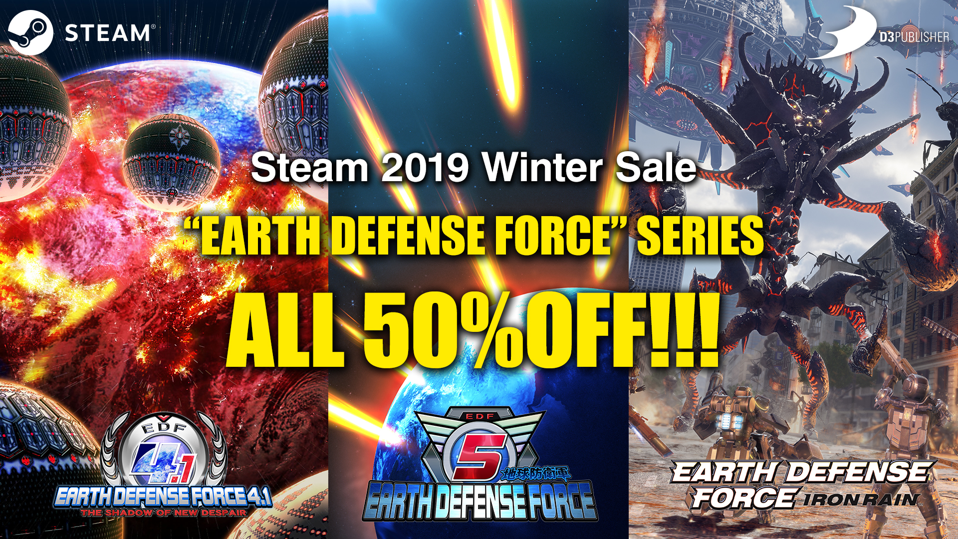 “EARTH DEFENSE FORCE” series conducts first franchise sale on Steam! Chance to get 50% off for “EARTH DEFENSE FORCE 4.1” and “EARTH DEFENSE FORCE 5”! 50% off sale on the mission pack DLCs of each series as well! Regarding “EARTH DEFENSE FORCE: IRON RAIN”, the game itself and the mission pack DLCs are all 60% off! Don’t miss this chance!! ▼Sale Period March 12th, 2020 10AM – March 16th, 2020 10AM. ※PST ▼Titles for Sale EARTH DEFENSE FORCE 5 【$59.99 → $29.99 <50% OFF>】https://store.steampowered.com/app/1007040/EARTH_DEFENSE_FORCE_5/?curator_clanid=36382239 EARTH DEFENSE FORCE 5 Mission Pack 1: Extra Challenge 【$11.99 → $5.99 <50% OFF>】https://store.steampowered.com/app/1057270/EARTH_DEFENSE_FORCE_5__Mission_Pack_1_Extra_Challenge/ EARTH DEFENSE FORCE 5 Mission Pack 2: Super Challenge 【$11.99 → $5.99 <50% OFF>】https://store.steampowered.com/app/1057271/EARTH_DEFENSE_FORCE_5__Mission_Pack_2_Super_Challenge/ EARTH DEFENSE FORCE: IRON RAIN 【$59.99 → $23.99 <60% OFF>】https://store.steampowered.com/app/1039890/EARTH_DEFENSE_FORCE_IRON_RAIN/?curator_clanid=36382239 EARTH DEFENSE FORCE: IRON RAIN DLC Mission : Golden Storm 【$12.99 → $5.19 <60% OFF>】https://store.steampowered.com/app/1106220/EARTH_DEFENSE_FORCE_IRON_RAIN__DLC_Mission__Golden_Storm/ EARTH DEFENSE FORCE 4.1 The Shadow of New Despair 【$19.99 → $9.99 <50% OFF>】https://store.steampowered.com/app/410320/EARTH_DEFENSE_FORCE_41_The_Shadow_of_New_Despair/?curator_clanid=36382239 EARTH DEFENSE FORCE 4.1 The Shadow of New Despair Mission Pack 1: Time of the Mutants 【$11.99 → $5.99 <50% OFF>】https://store.steampowered.com/app/410780/Mission_Pack_1_Time_of_the_Mutants/ EARTH DEFENSE FORCE 4.1 The Shadow of New Despair Mission Pack 2: Extreme Battle 【$11.99 → $5.99 <50% OFF>】https://store.steampowered.com/app/411380/Mission_Pack_2_Extreme_Battle/ EARTH DEFENSE FORCE 4.1 WINGDIVER THE SHOOTER 【$19.99 → $2.99 <86% OFF>】https://store.steampowered.com/app/574200/EARTH_DEFENSE_FORCE_41_WINGDIVER_THE_SHOOTER/?curator_clanid=36382239 [previewyoutube="Em7UD4X4rBg;full"] D3PUBLISHER “2020-Lunar New Year Sale” January 24, 2020