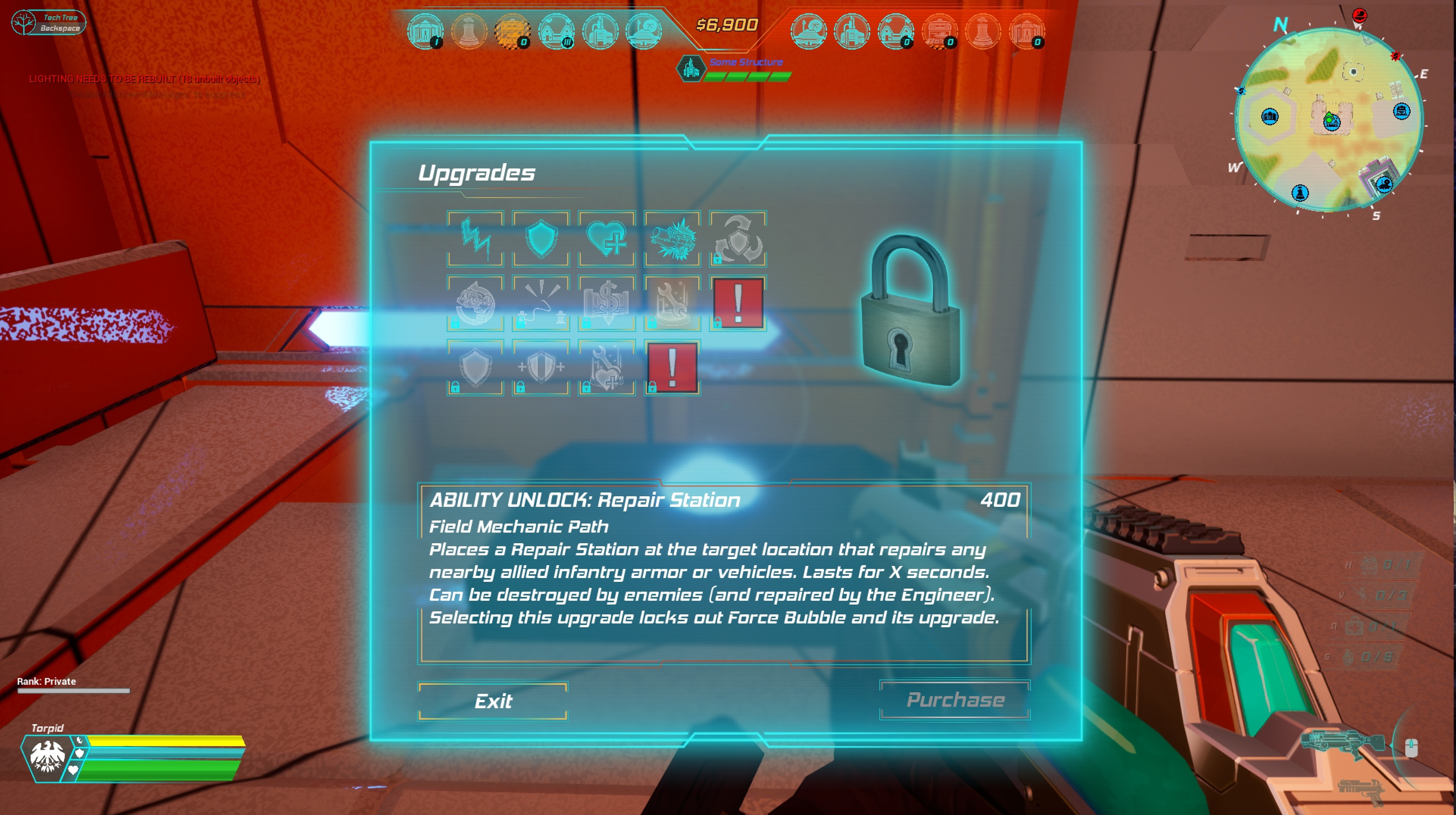 Our Engineer begins with the Repair Gun and Pistol, filling out the primary and secondary weapon aspects. For his minor ability, the Engineer gains proximity bomb: these are small sticky mines that can be placed on surfaces and explode when enemy infantry get near. For his primary abilities, he has a choice between the Repair Station we mentioned in a previous diary (a place-able object that repairs in a radius) or the Force Bubble ability, which creates a force field around an infantry, turret or Control Core (the structure weak points mentioned last time). You can only pick one of the major abilities, so choose wisely.