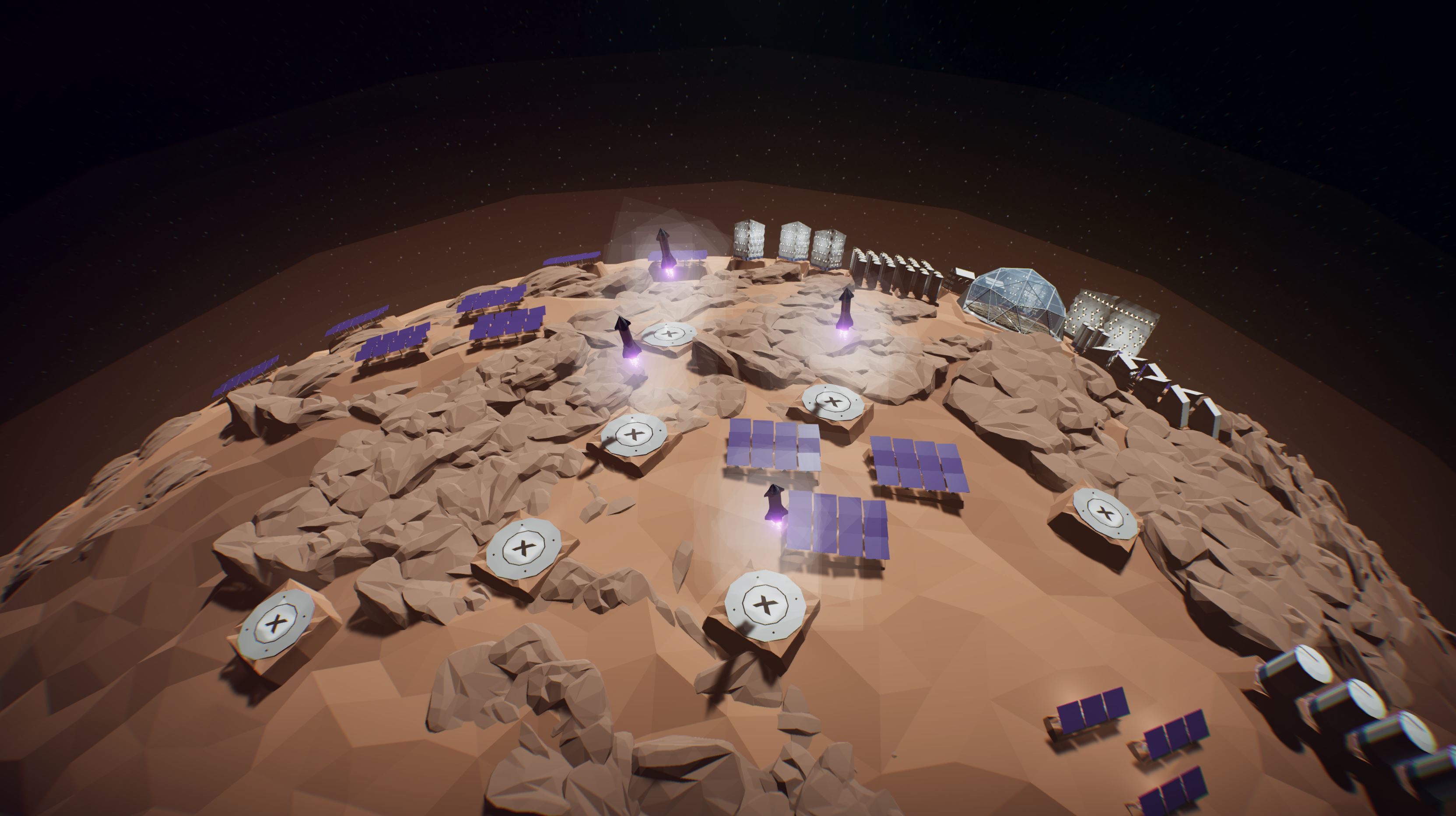 This screenshot shows how Spaceships can land on Mars. Rykllan did an amazing job on the models, again. Personally, I love the connection between building colors and Mars colors (+ the rocks). What do you think?