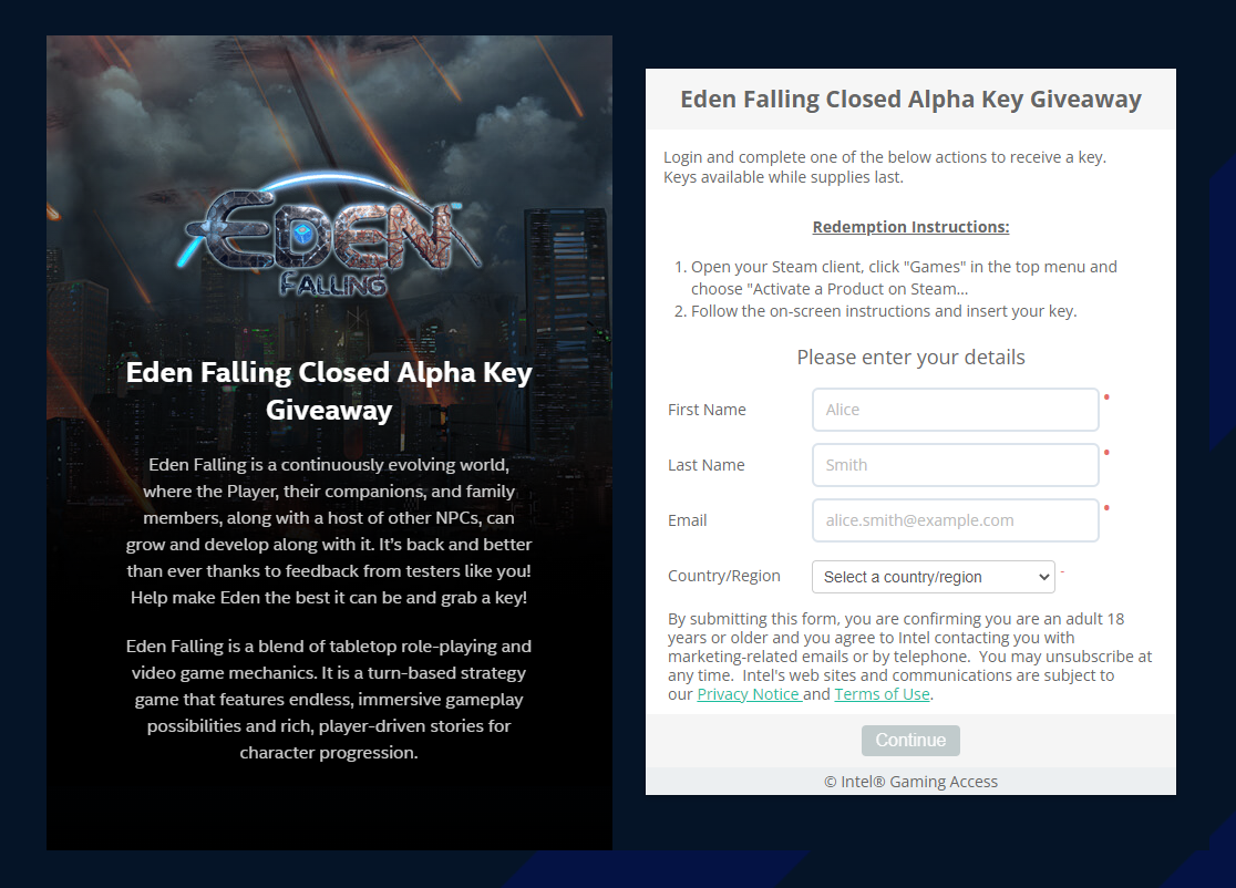 For those of you who have always wanted to take Eden Falling for a spin but haven’t known how, this is your moment! You can get a FREE key for the closed Alpha over on Intel Gaming Access when you fill out this form: