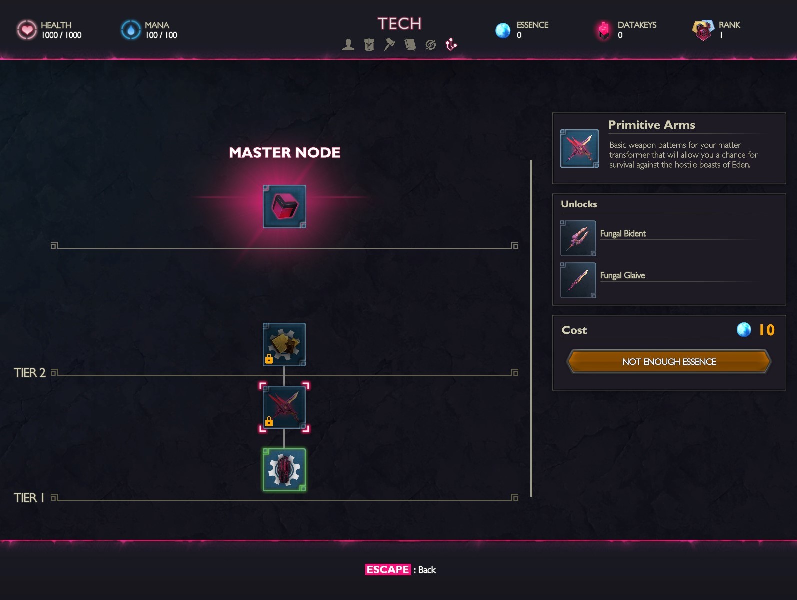 There is a wide variety of weapons in Eden, and even more coming. To give players a better understanding of their options and the strengths and weaknesses of each we are adding a weapon tree UI that will demonstrate the different branching paths each weapon can take.