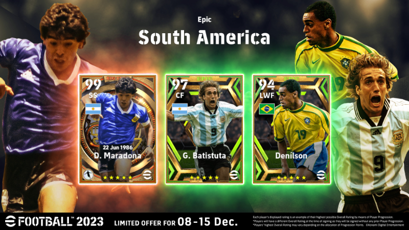 In addition to the 3 Epic players listed below, 147 other currently active players with Player Value ★★★ or higher will make an appearance in the Special Player List. Available Players: Denílson, D. Maradona and G. Batistuta.