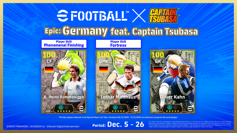 We will be adding challenges during the times shown below. After the addition of new challenges, you will be able to complete all Objectives. Round 1: 12/12/2024 02:00 (UTC) Round 2: 12/19/2024 02:00 (UTC) Complete all Challenges, and earn the following rewards in total. ・ Highlight: Joshua Kimmich (Hikaru Matsuyama) ・ Highlight: Dayot Upamecano (Ryo Ishizaki) ・ Piece "Captain Tsubasa Vol. 1" x2 ・ Avatar Set "Captain Tsubasa" (3 variations) ・ Uniform "Captain Tsubasa" (2 variations) ・ Badge "Captain Tsubasa" (4 variations) ・ 100 eFootball™ Coins ・ Random Booster Token x2 ・ Skill Training Program x2 ・ Position Training Program x1 ・ 168,000 Exp. ・ 260,000 GP Please check each individual Objective for more information on the rewards and the completion conditions. *Select [Missions] > [Objectives] from Home to check each Objective. To set your newly acquired Badges, go to [Extras] > [User Information] > [User Details]. To set your new Avatar, go to [Extras] > [User Information] > [User Details].