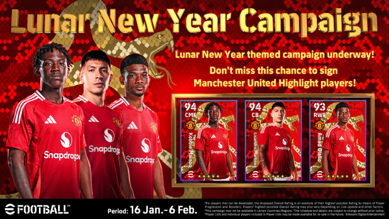 Campaign Objectives Lunar New Year Take part in eligible Events and eFootball™ League, and aim to complete all Objectives! Period 01/16/2025 02:00 (UTC) - 02/06/2025 01:59 (UTC) This Objective will be added on 01/23/2025 02:00 (UTC). Complete all Challenges, and earn the following rewards in total. ・ Select Booster Token x100 ・ "Highlight: Manchester United" Chance Deal x2 ・ Avatar Set (Manchester United) ・ 150 eFootball™ Coins ・ Skill Training Program x2 ・ Position Training Program x2 ・ 94,000 Exp. ・ 160,000 GP
