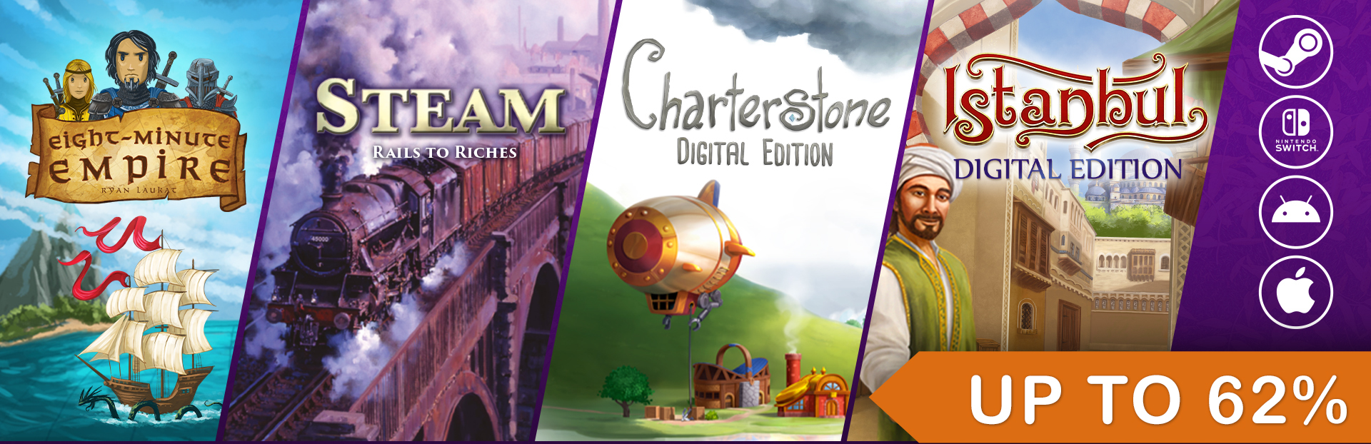 Have I mentioned prizes? There will be prizes! The prize pool includes Roam, Megaland, Eight-Minute Empire: Legends, Eight-Minute Empire: Lost Lands and the base game of Eight-Minute Empire (sponsored by the game's designer and publisher Red Raven Games) as well as a bunch of codes for our digital board games - Istanbul: Digital Edition, Eight-Minute Empire (should you wish it for another platform, or as a gift), Steam: Rails to Riches and even Charterstone: Digital Edition!