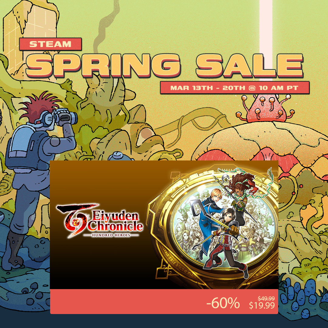 For a limited time, Eiyuden Chronicle: Hundred Heroes is 60% off during the Steam Spring Sale! Don’t miss your chance to shape the future of Allraan in this must-play adventure for JRPG fans. Eiyuden Chronicle: Rising is also 70% off!