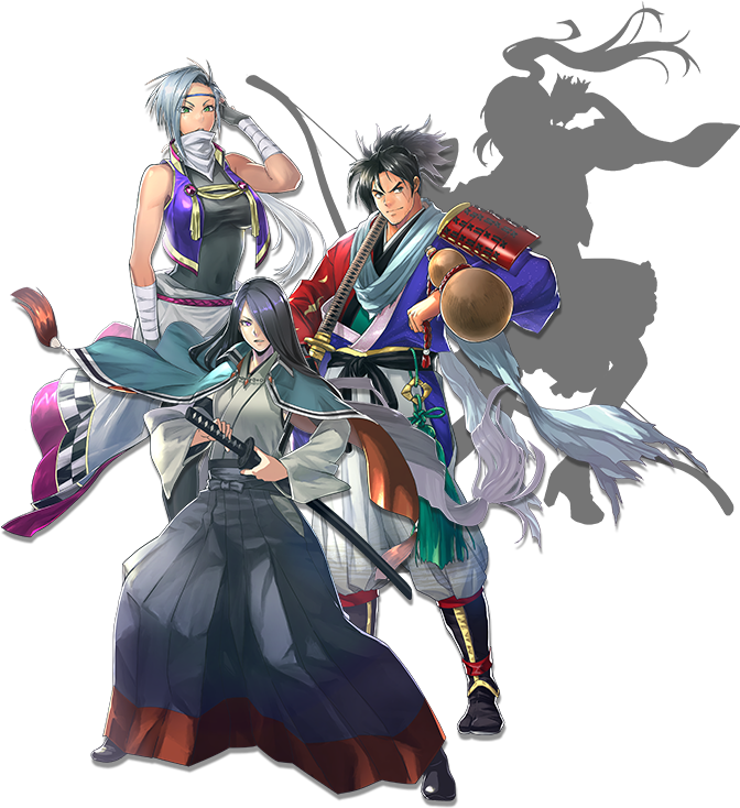 TALES OF THE YOKAI HUNT Featured heroes: Iugo, Mio, Hakugin, etc Sample Story: Join forces with a samurai Iugo, a ninja Mio, and a swordswoman Hakugin on a secret mission from the East Reach to put down the escaped yokai (monsters). Survive challenging boss level battles!