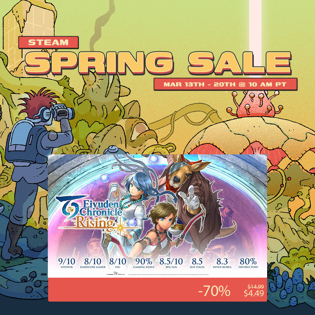 If you’re a fan of JRPGs, classic adventure stories, and rewarding progression, Eiyuden Chronicle: Rising is 70% off during the Steam Spring Sale! Don’t miss the chance to experience the beginning of this epic saga. Also get Eiyuden Chronicle: Hundred Heroes 60% off during the Spring Sale!
