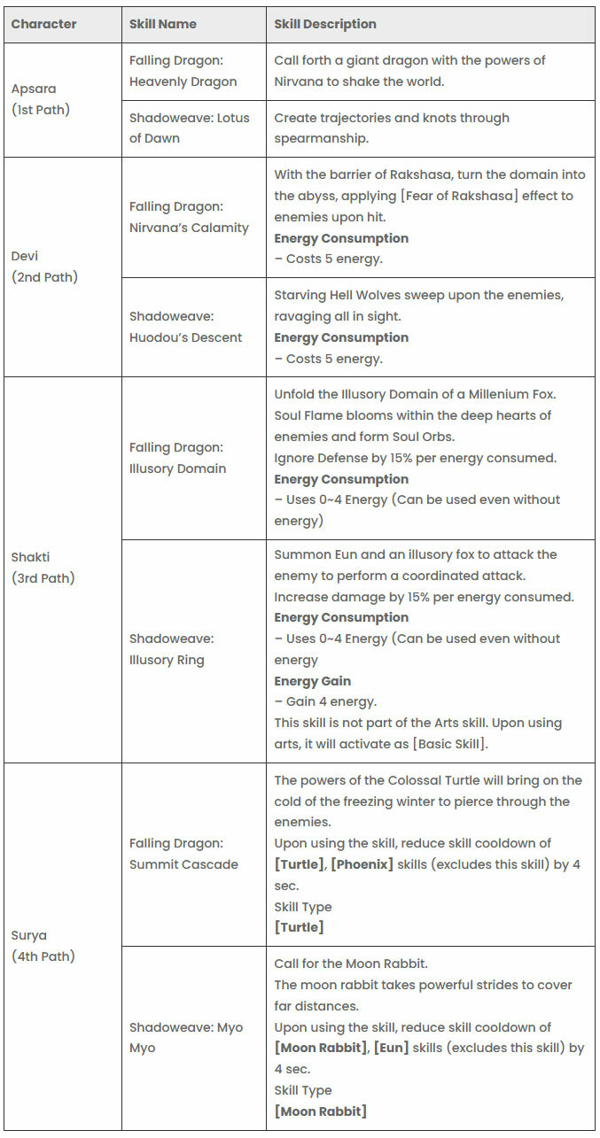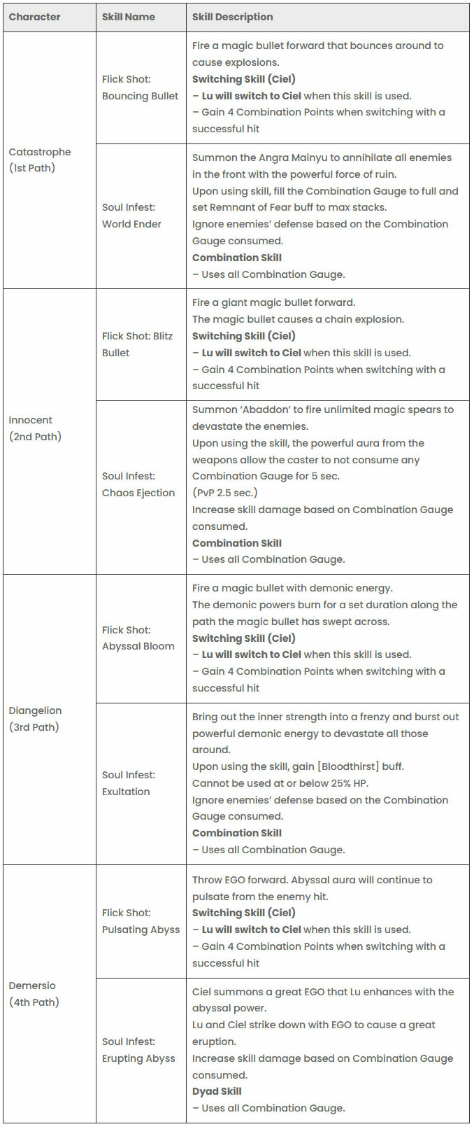 [Blessing of Moonlight] Upon awakening, enhance skill effect depending on the shape of the moon.[/td] [/tr] [tr] [td]Morpheus (4th Path)[/td] [td]Quick Strike: Blood Etch[/td] [td]The remnants of someone cruel and frightful. Don’t worry, just walk forward like this.An unknown being appears everywhere to swipe the space and attack enemies.