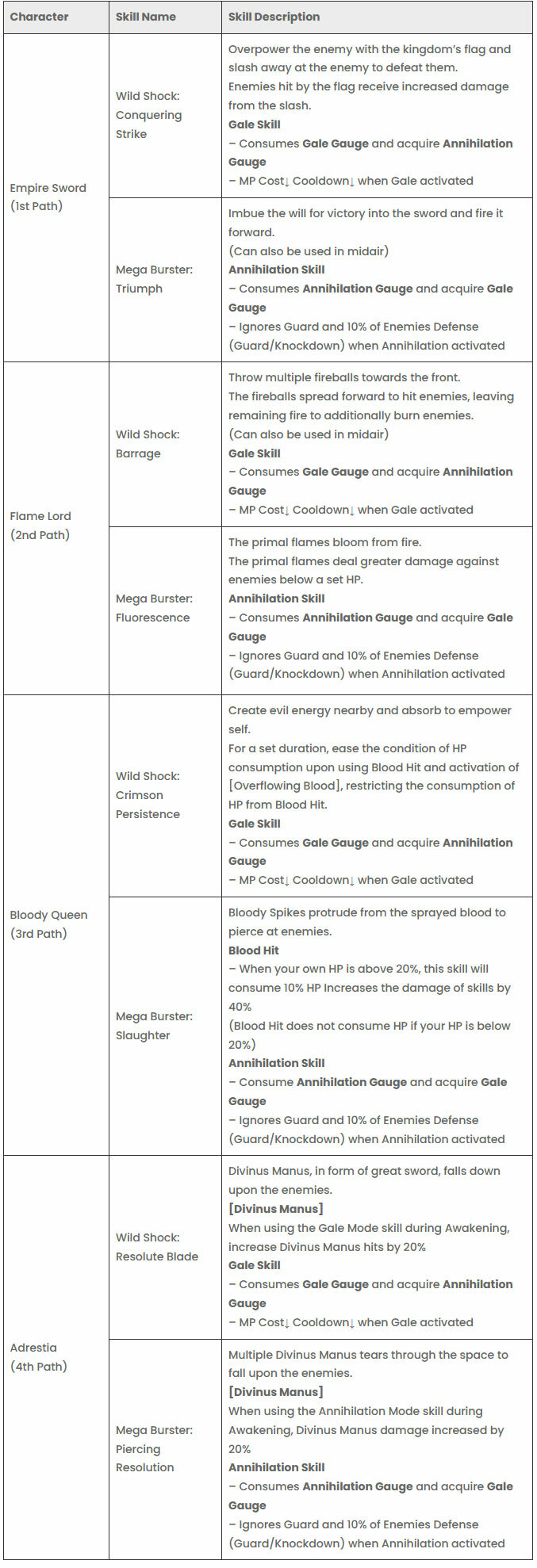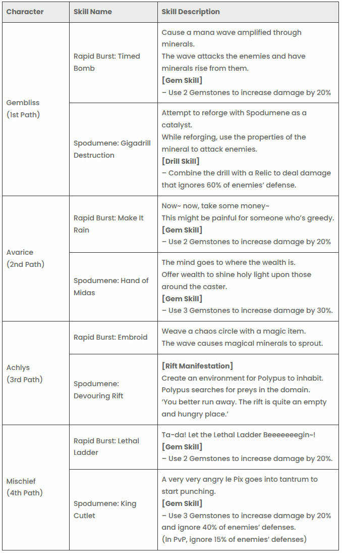 Cannonball Consumption - Uses 6 Cannonballs[/td] [/tr] [tr] [td]Dius Aer (4th Path)[/td] [td]Scare Chase: Timely Rain[/td] [td]Bring on the rain to those in need to refresh the duration of [Dius Aer] effects applied to allies.[/td] [/tr] [tr] [td]Dius Aer (4th Path)[/td] [td]Aceldama: Good News[/td] [td]Purify the rejected with the echoing news of the holy sanctuary.[/td] [/tr] [/table] Add [table] [tr] [td]Character [/td] [td]Skill Name[/td] [td]Skill Description[/td] [/tr] [tr] [td]Doom Bringer (1st Path)[/td] [td]Void Breaker: Burst Rush[/td] [td]Concentrate powerful energy and blast forward to attack enemies. (Can also be used in midair)