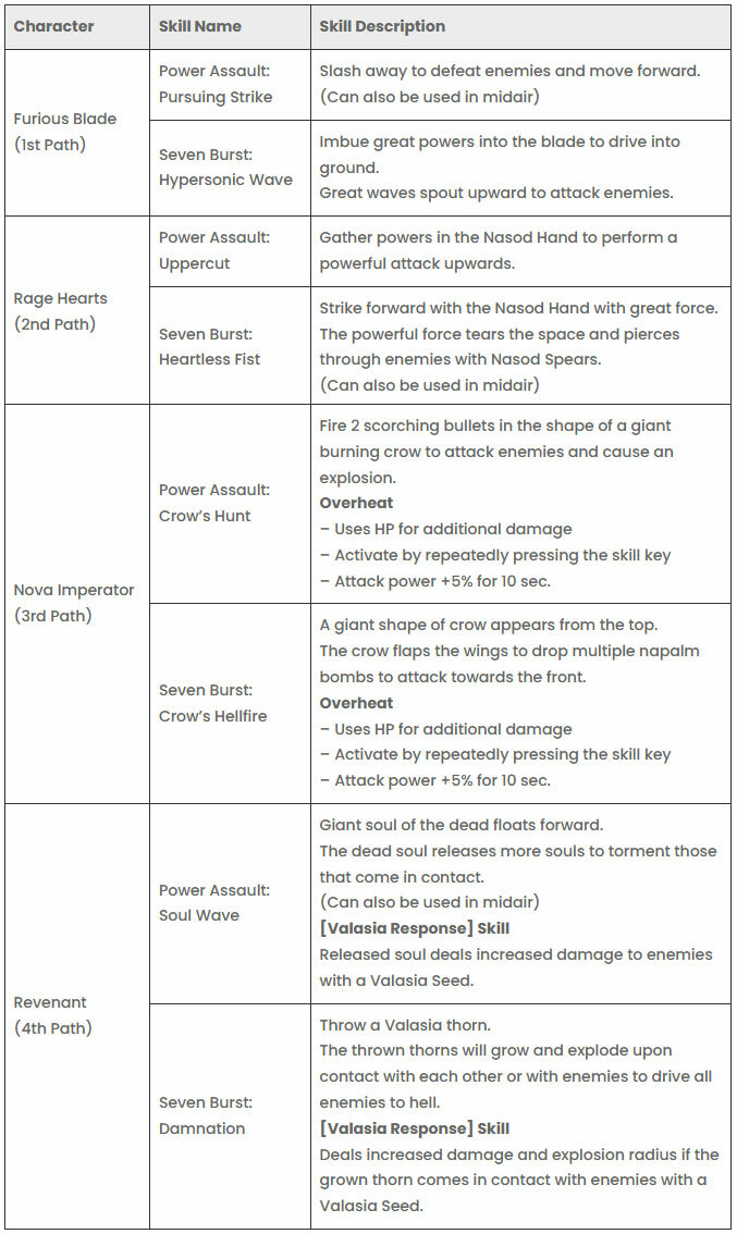 Rau - Damage increases by [Rau Stage x 10%][/td] [/tr] [/table] Noah [table] [tr] [td]Character [/td] [td]Skill Name[/td] [td]Skill Description[/td] [/tr] [tr] [td]Liberator (1st Path)[/td] [td]Quick Strike: Night Rush[/td] [td]The shadows rush in darkness. (Can also be used in midair)