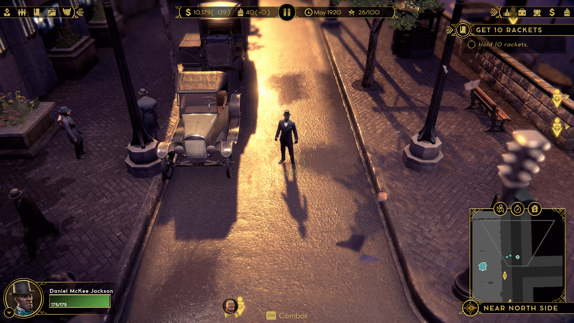 Prosperity in game terms is people’s willingness to go out and spend money in a neighbourhood. As this is the roaring twenties, Prosperity intrinsicity rises every month. Spending money on improving rackets increases Prosperity. On the other hand, the body count, the amount of people getting killed in a neighbourhood (and especially police), pushes it down. Prosperity modifies the maximum number of customers for each racket in the neighbourhood which effectively influences how much money the rackets make. There are other routes to influence how much money rackets make, for example we could have simply altered how much money people were willing to spend in rackets. However, the way we chose has a neat additional effect, customers will naturally move from low prosperity to high prosperity neighbourhoods and stay there. This has two additional consequences: long wars will inflict long-term harm on businesses in the neighbourhoods where the war is being fought. It gives you an incentive to exit a war if it is being fought in territory which you want to keep and also gives an additional way to attack the enemy. You do not need to take the racket. Just drive the customers away and inflict long term damage to the opponents.