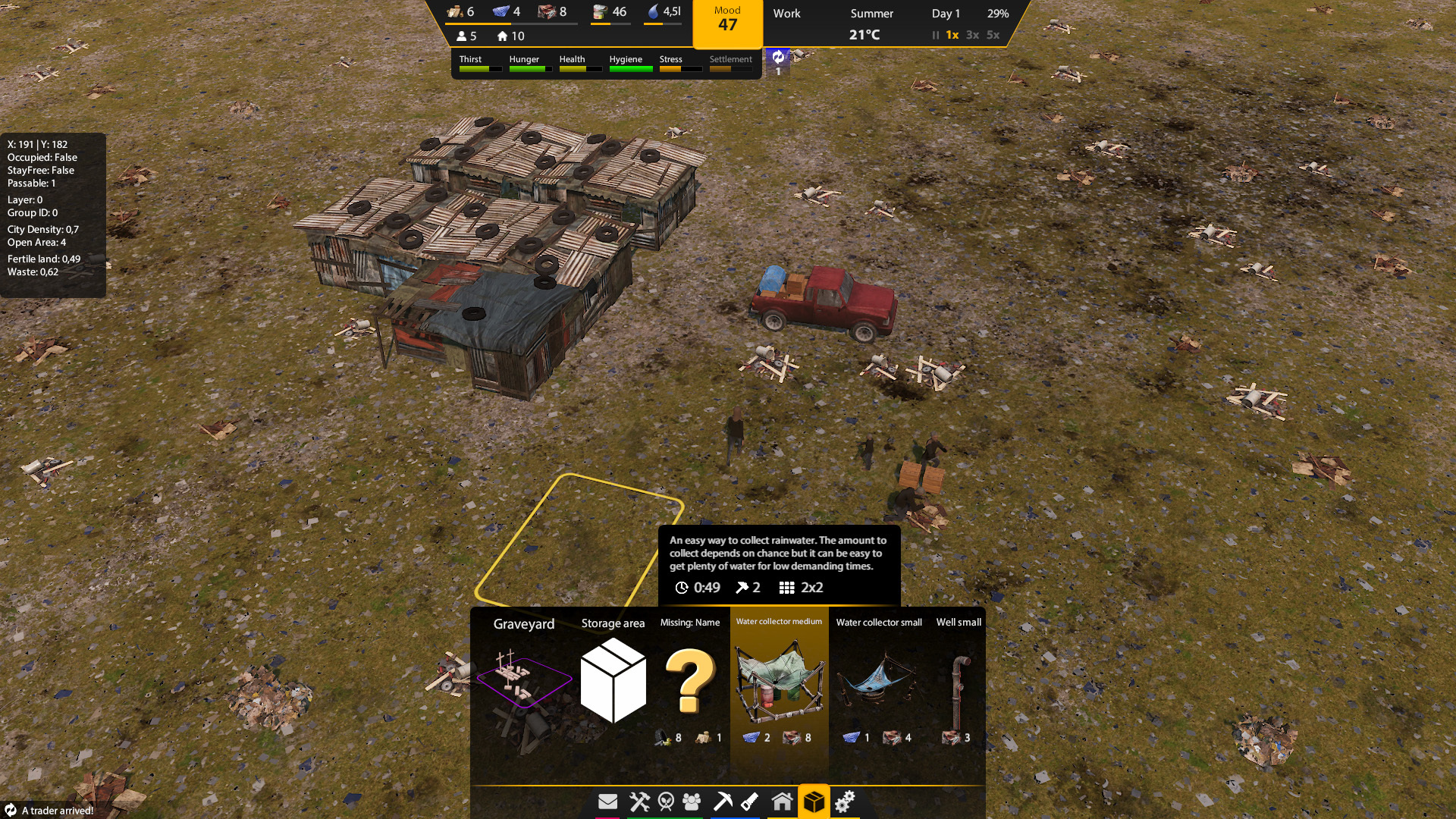 Town info There are banners on the top panel which tell you what is going on in the town. You can click on these and they select the affected entities or open a window. Here they show 5 homeless, 2 thirsty people, an available trader and 2 people who want to join the town.