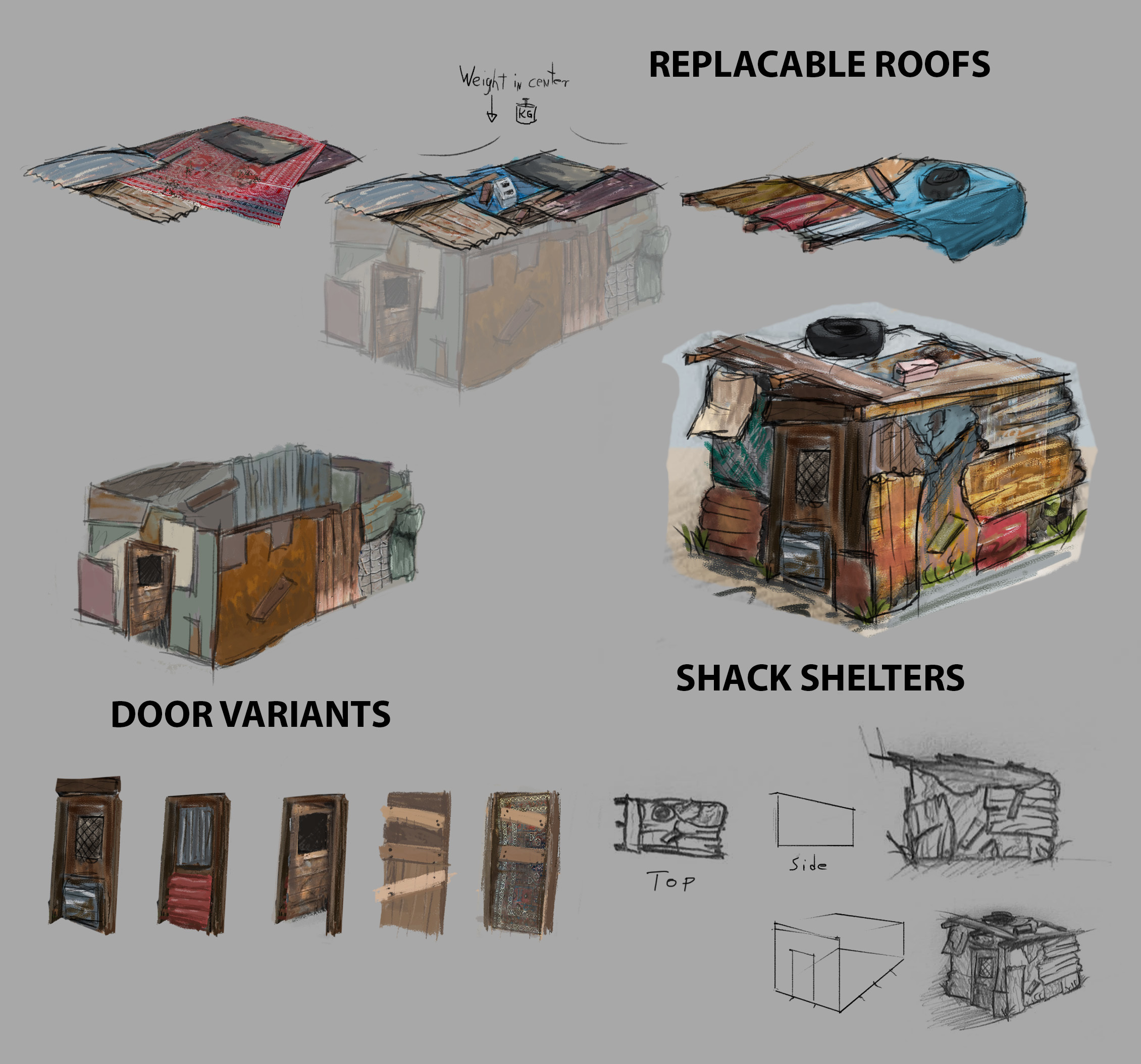 My drawing skills are limited but I do my best to brief the artists so they know what i have in mind. For the buildings we try to minimize modelling effort and texture space by reusing and replacing parts. We want to model seperate elements and later merge everything down to one mesh.
