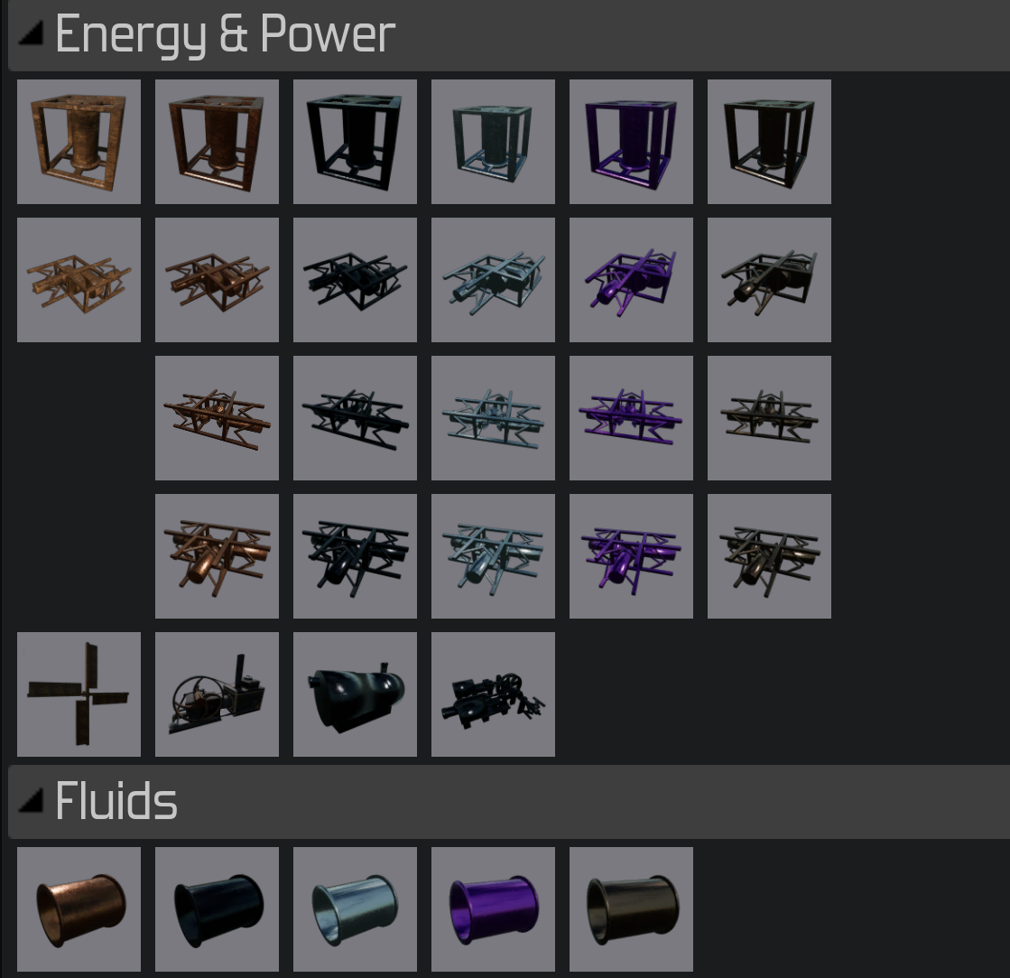 For other development tasks I started working on adding in the new steel tier of machinery, parts, and connectors. In doing so I realized that while I was working on it I should add in the higher tiers as well. I also decided there was no real reason to restrict the player from having access to these items & buildings (as the existence and nature of these later tiers I have mentioned before). Feel free to play around with these buildings and marvel at how much power a tungsten shaft can transmit.