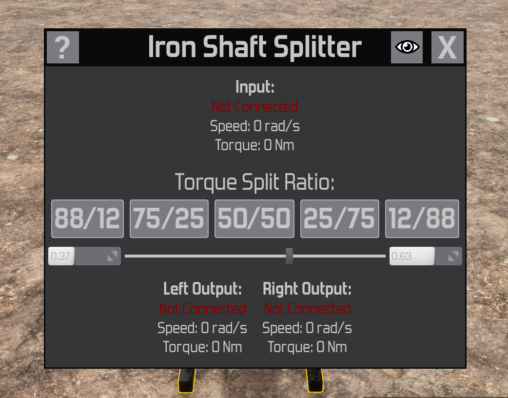 In 0.7 shaft splitters will not longer be locked to using a select few options for how power is split between the two outputs. You the player will will have full control of what percentage of torque will go either direction. The old buttons will still remain as a set of quick pick options for convenience. You will be able to move the slider to change on a single percent as well as type in values to change to several decimal places. I decided to make this change because it didn't really add to the building to have things be limited in the way that they were as you still have to manually go up to the building and decide where to send the power you can just send more of it to where you want it.