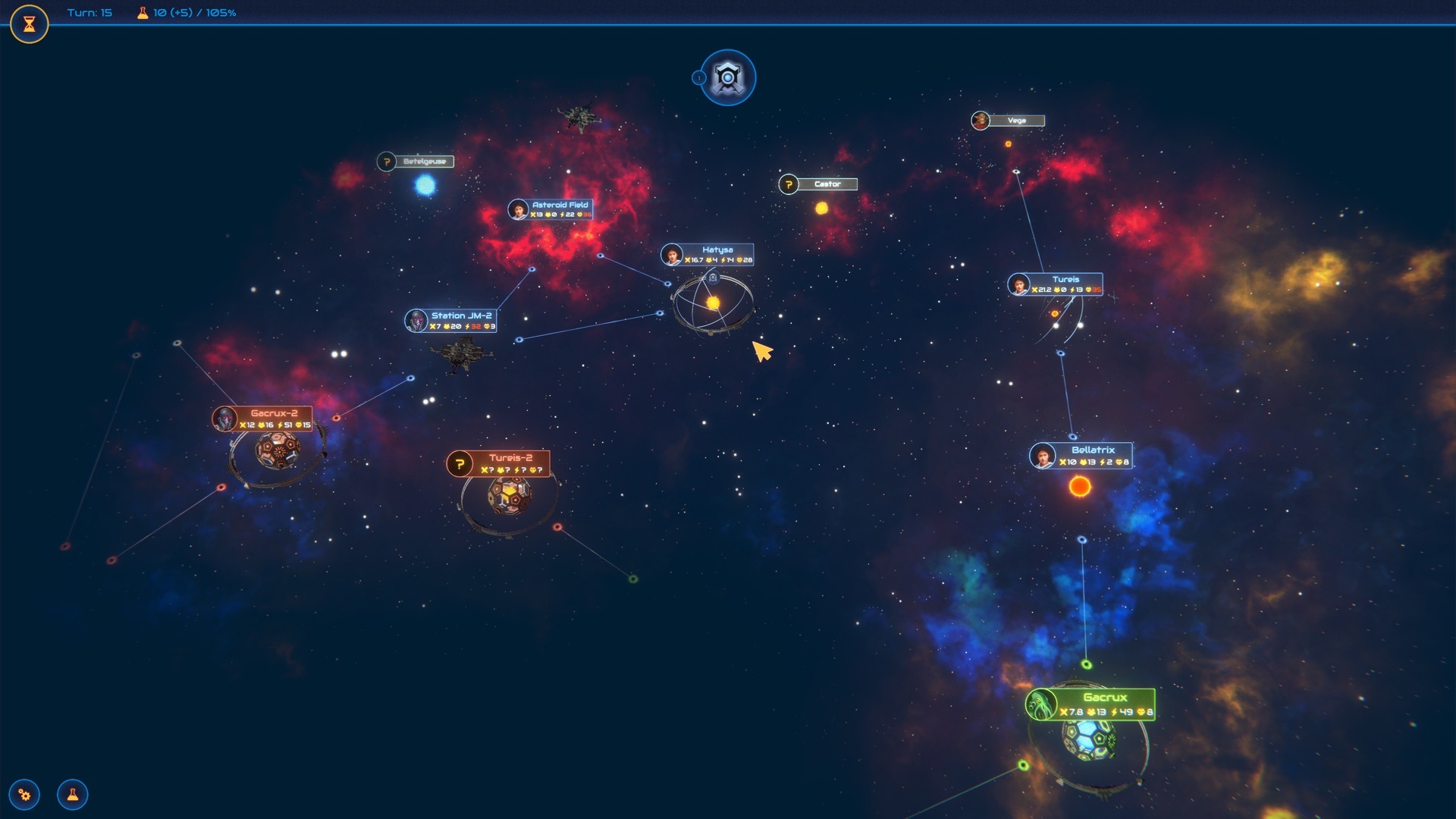 After two more months the game changed pretty dramatically. I added space stations for tech research, asteroid fields, fog of war, sounds and music, better graphics, and, finally, implemented the supernova mechanic. The game started to really shape up and I was ready to let players try out an early beta.