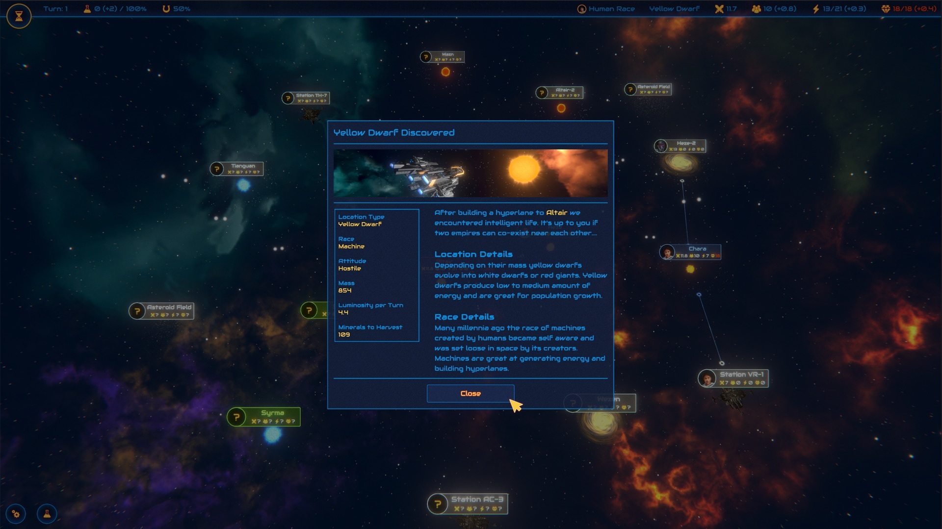 Another change that this update introduces has to do with locations that don’t belong to players. Before this update all non-player locations were unpopulated and whenever a player built a hyperlane to such a location it would automatically become theirs. Now, some locations have neutral civilizations that don’t expand or build structures. All resources around such locations increase every turn at a low rate and whoever builds a hyperlane to a neutral location will also have to attack it in order for it to become theirs.