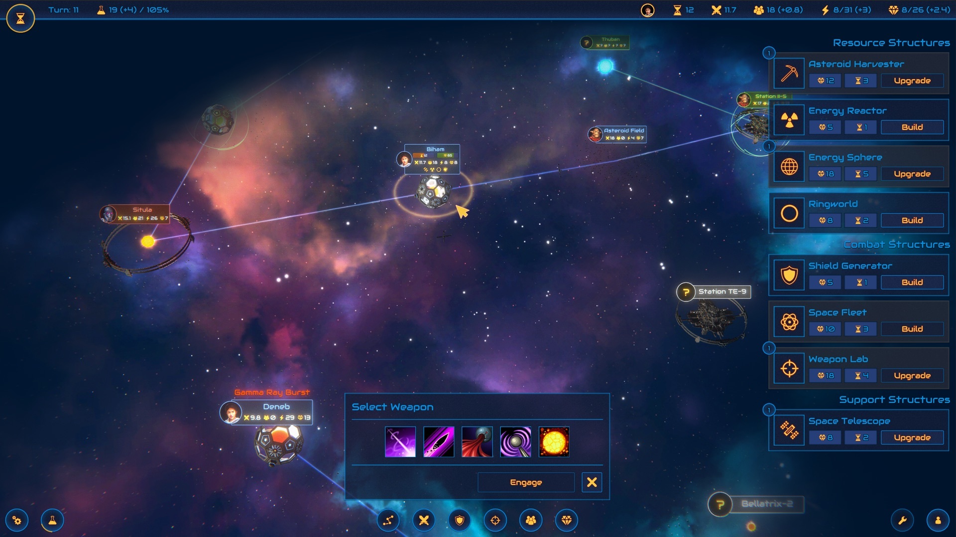 Adding weapons to the game has been on my mind for at least three months now and it’s finally here! This mechanic adds another dimension to the game by introducing special actions themed as “weapons” that allow the player to influence other stars and stations without having direct access to them through hyperlanes and wormholes.
