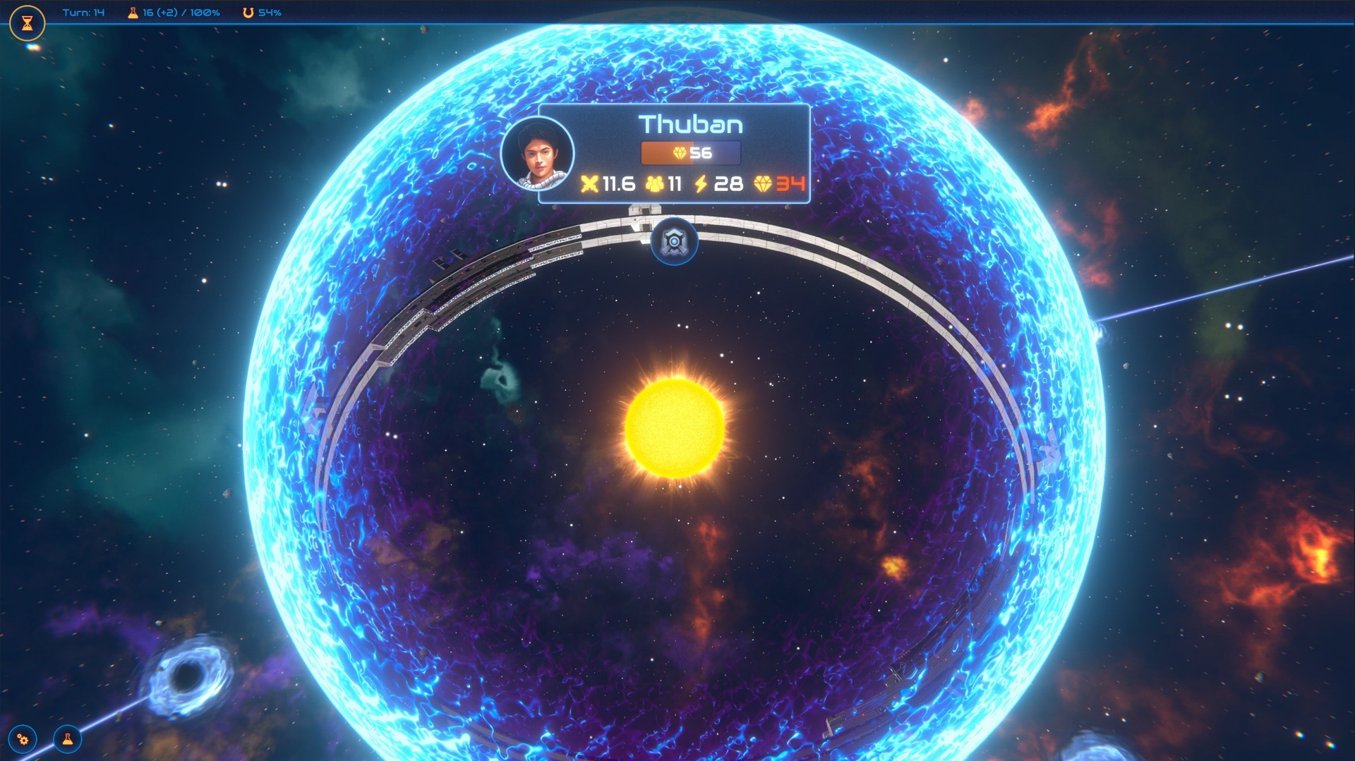 The first prototype was an RTS game with active pause. All stars had a certain amount of “health” that really was just the amount of energy they had left before collapsing into a black hole. The player could build three buildings around captured stars: energy spheres for capturing energy, ringworlds for growing population, and space fleets for higher combat strength. To reach other locations the player had to create hyperlanes. The game only featured two resources—energy and population—that were used for all actions.