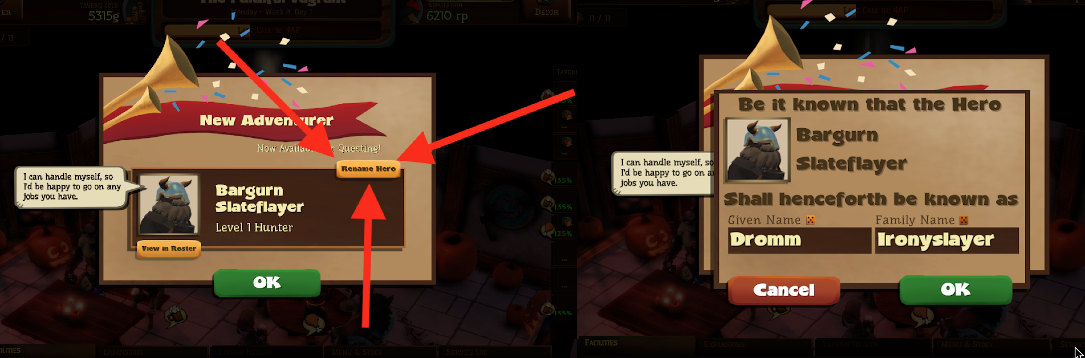 While some character names are hard-coded, the majority of patrons in your tavern can now be renamed at the moment of hire! In this first incarnation of the feature, it’s still easy to miss. A pop-up screen appears when you hire a hero. There’s a button on it that lets you rename any character whose name isn’t hard-coded. We’ll make this easier to spot in future builds, but it is up and working, so we wanted to make the feature available to you folks ASAP. Much like our random tavern name generator, we have a random character name generator you can access by clicking the little yellow dice above the name fields.