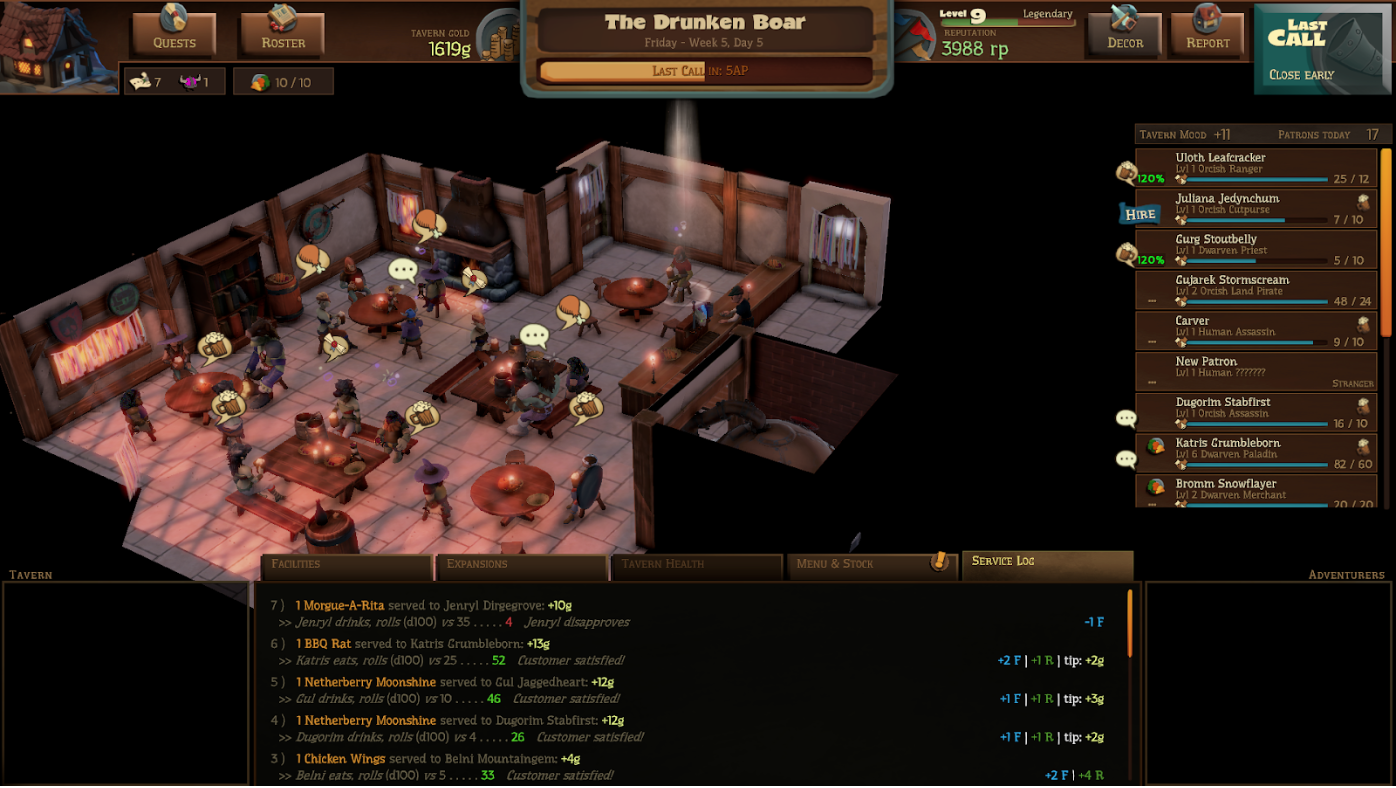 You’ll notice that cups and plates will now accumulate on tables as you serve patrons. While you can ignore them and leave the work for the kobold cleaning crew, clicking on dishes to remove them will gain you a bit of free reputation for your tavern, allowing you to more quickly expand the size of your roster.
