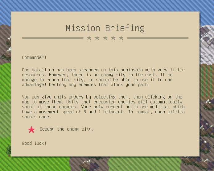 Over the last few months, community member Zanath has made a 3-act, 18-level campaign that will be integrated into the game in the upcoming update. Each level explains a new unit or mechanic and poses a different challenge. As a preview, here is the mission briefing for the first level (Act 1, Level 1):