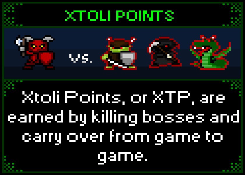 New to the game as of right now are Xtoli Points (or XTP for short). You earn them from defeating bosses in battle and these carry over from game to game. The absolute max XTP is 99.