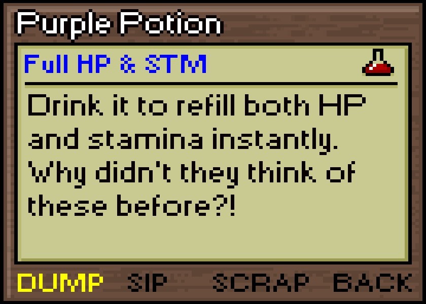 I chose the term 'dump' over 'empty' because it looked too similar to 'equip' at a quick glance. And the term 'sip' really helps the player know that HEY this item has some different commands to it, yeah!?
