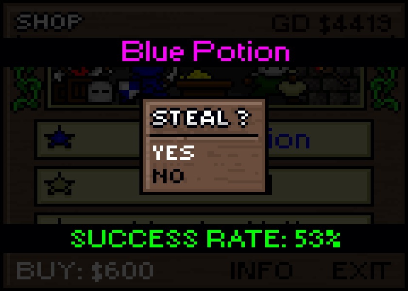 The penalty for getting caught is extreme. I didn't want to go the Spelunky or Shiren the Wanderer route and have the shopkeeper kill you or whatever, so instead what happens when you get caught is: