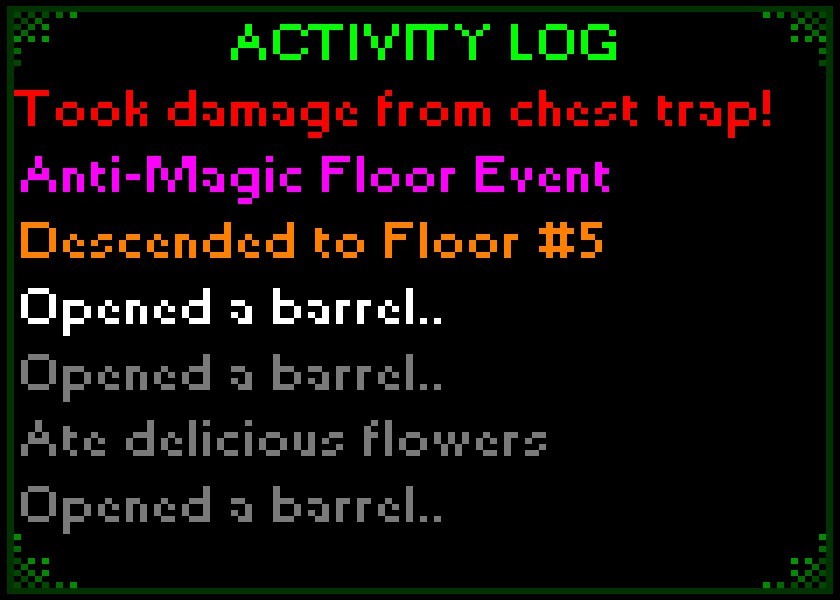 New Text Log! This does just what you think it might- It'll display the last 7 actions (or reactions) you've come across while playing. Like the 'special' screen, this can be fun to look at and sometimes pretty helpful (example: It's great for seeing if a floor has multiple floor events and things like that). One of the recent reviews said that though he liked the game he wished it would have a log like this.. So now it does!
